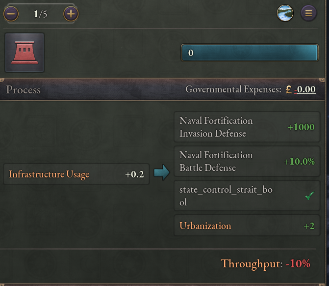 Naval Fortifications, of course, are a new building, constructed at the coasts of your country. They take a lot of time to be built, and there’s a low limit to how many you can build in every state.
