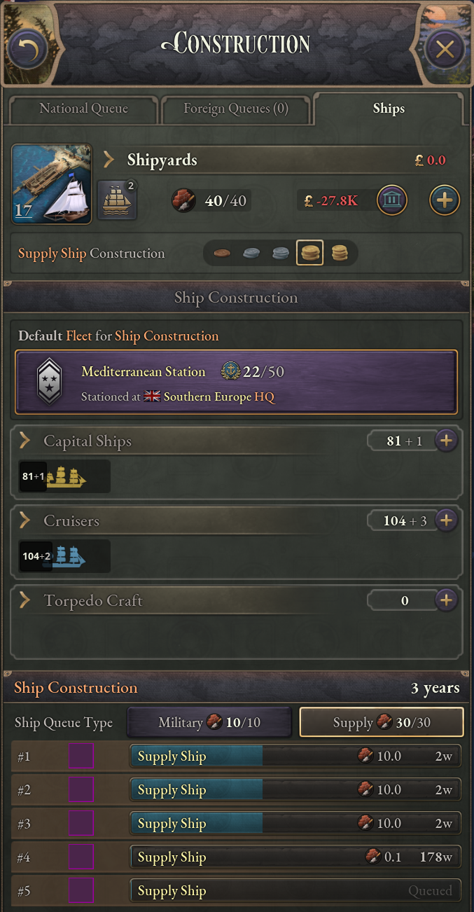 Very similarly to Construction Sectors, Shipyards now provide a capacity of ship construction points per week. A ship in construction (e.g. the future Dreadnought HMS Claudius) has a maximum number of points per week she can be assigned. If you have more ship construction capacity available than the highest entry on your ship construction queue can receive, the second highest entry will get the overflow to build it in parallel. This parallelization can be quite crucial if you want to secure a Navy to dominate the seas, since we’re also making the big ships’ construction take a long time—as they did historically. A dreadnought will take multiple years to construct in Victoria 3, while smaller vessels like Torpedo Boats can be produced at a much higher rate.