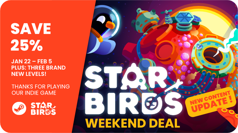 Steam offered us a Weekend Deal, and we said YES! From January 22 to February 5, you can fly to space with a 25% discount.This couldn’t come at a better time: our Flora & Fauna Update has just hatched. It introduces three brand-new levels and takes you on a journey to a new star system, where you’ll encounter aliens, grow plants, and set up food production. And for everyone who prefers freedom over campaigns, our brand-new Level Generator lets you create your own challenges and jump straight into Free Play.We hope you enjoy the deal and the update - have fun out there! Happy weekend, everyone! ????????Download Star Birds & Join Our NewsletterStar Birds is an indie project by Toukana Interactive and kurzgesagt. We are over the moon to have such an amazing community. You are the reason why this project exists. If you want to support us, download the game here on Steam, and tell your friends about it. If you would like to be the first to read content like this and are looking for more in-depth insights, we recommend our newsletter – sign up at https://toukana.com/starbirds.