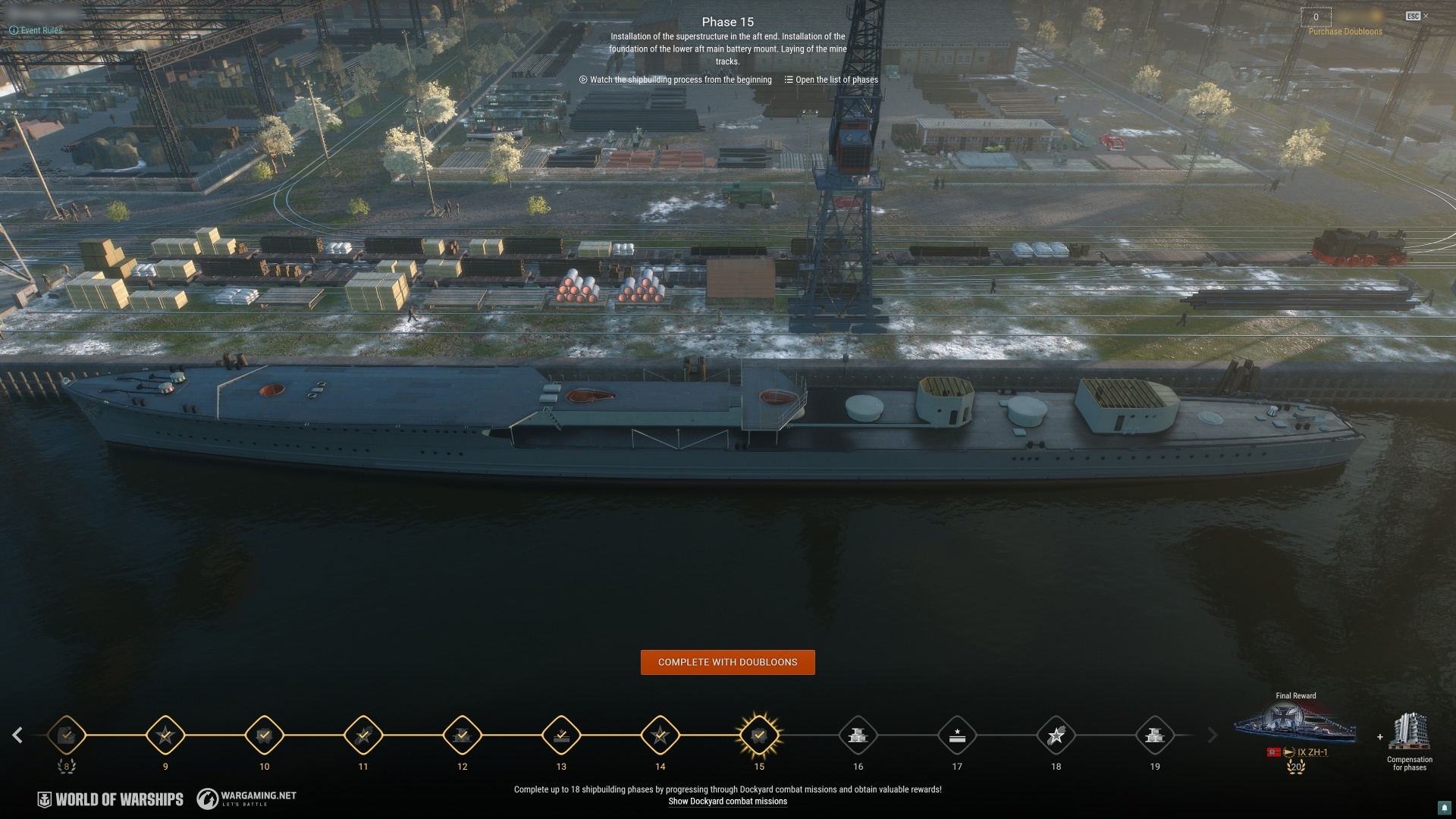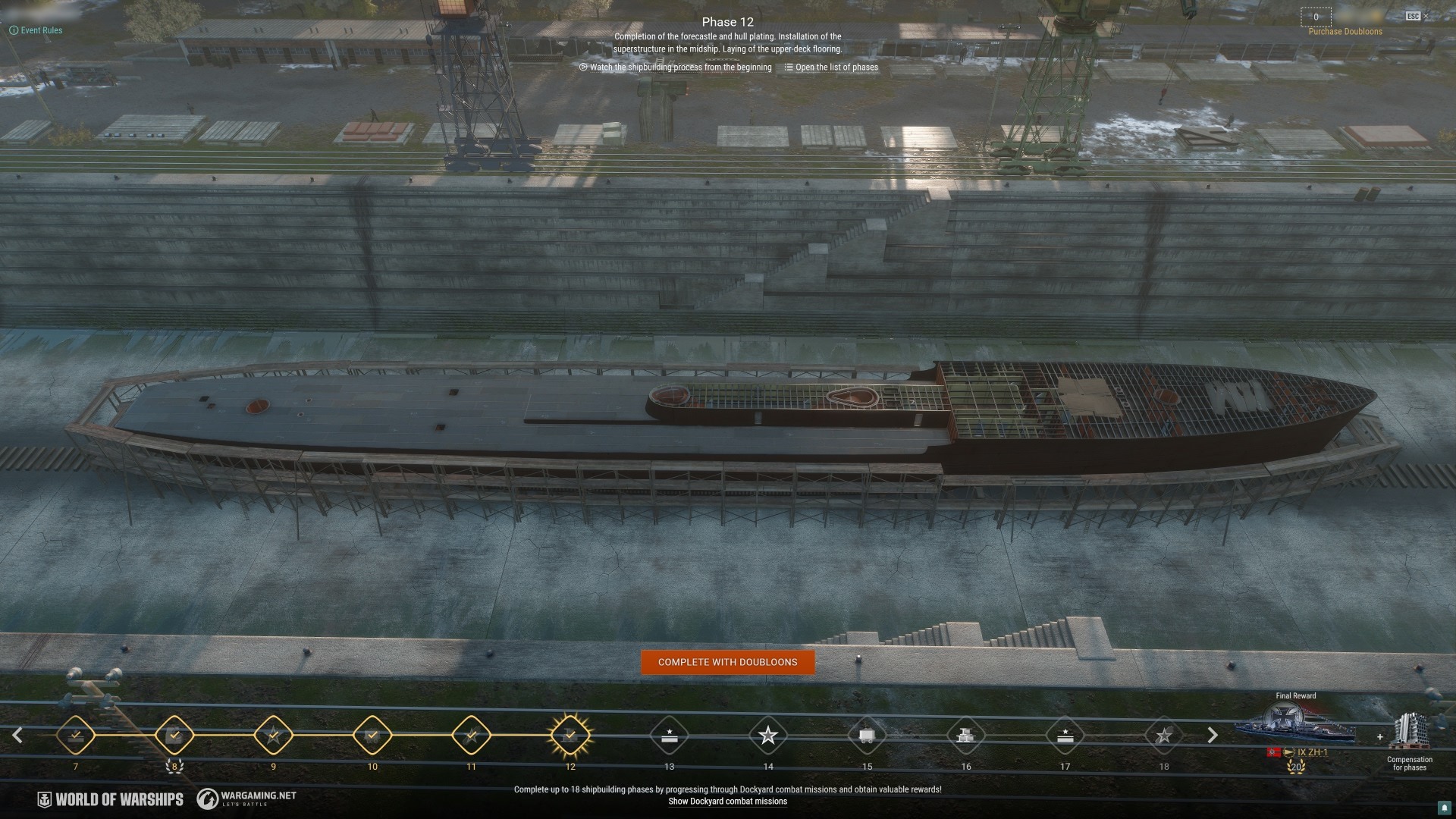To complete her, you'll need to advance through 20 shipbuilding phases—18 via combat missions and two for Doubloons.