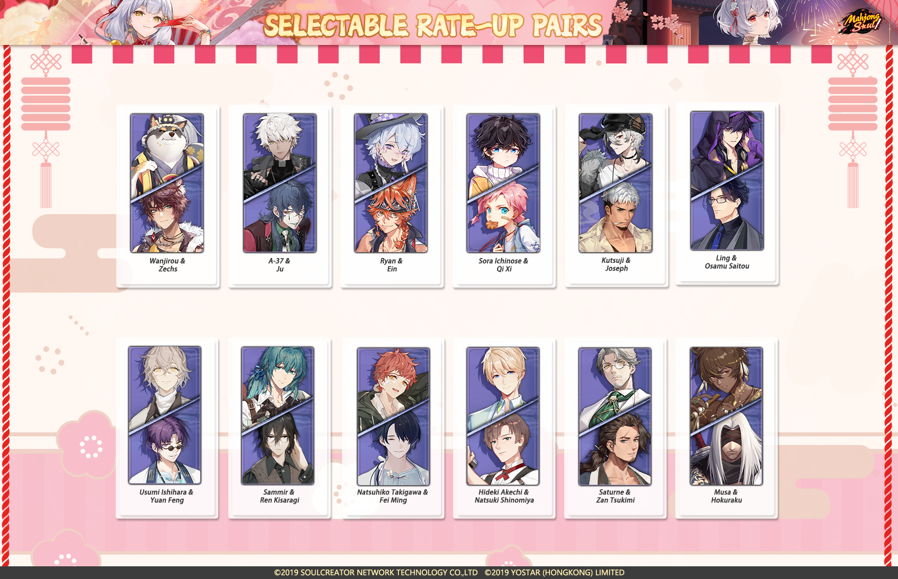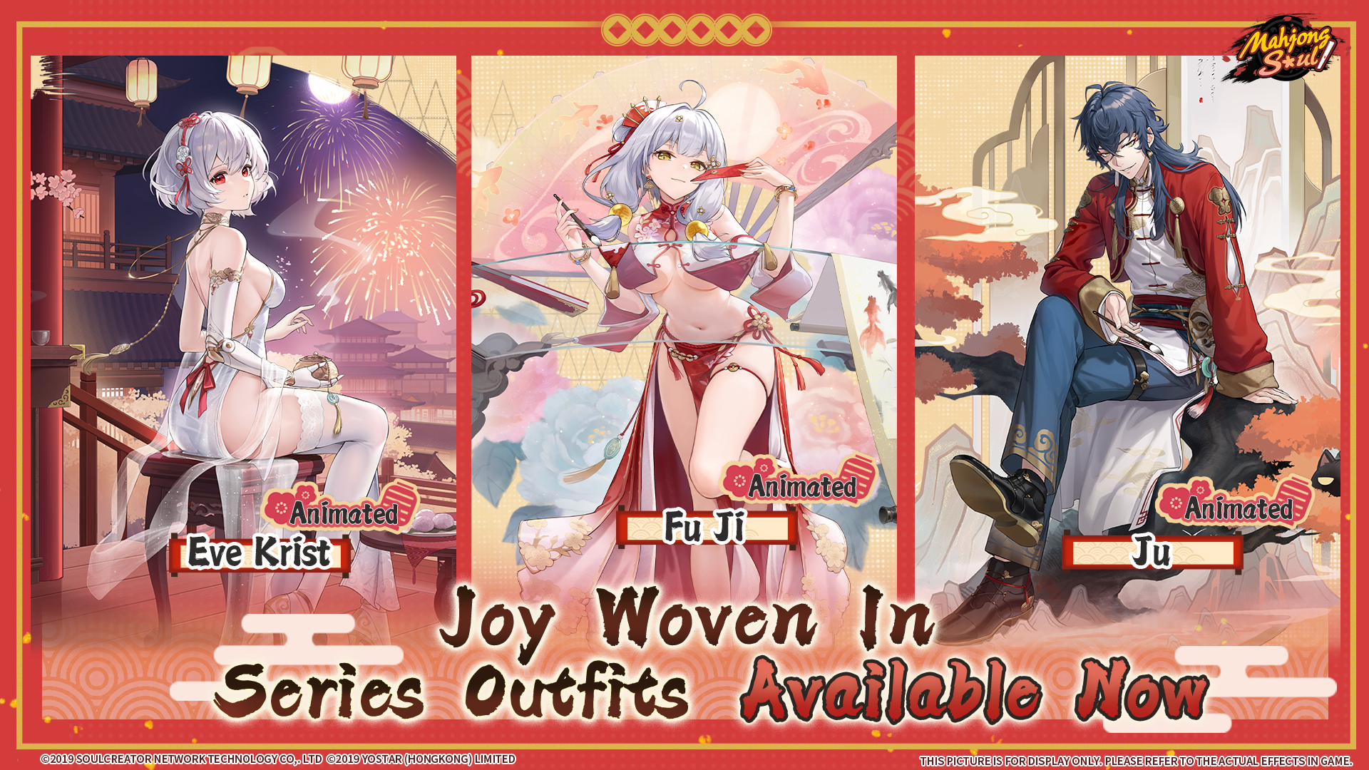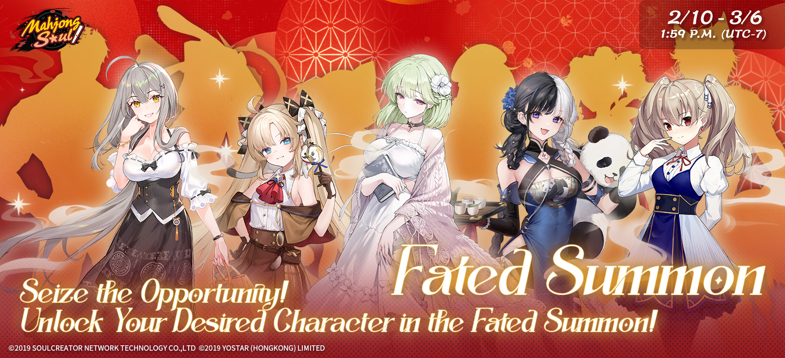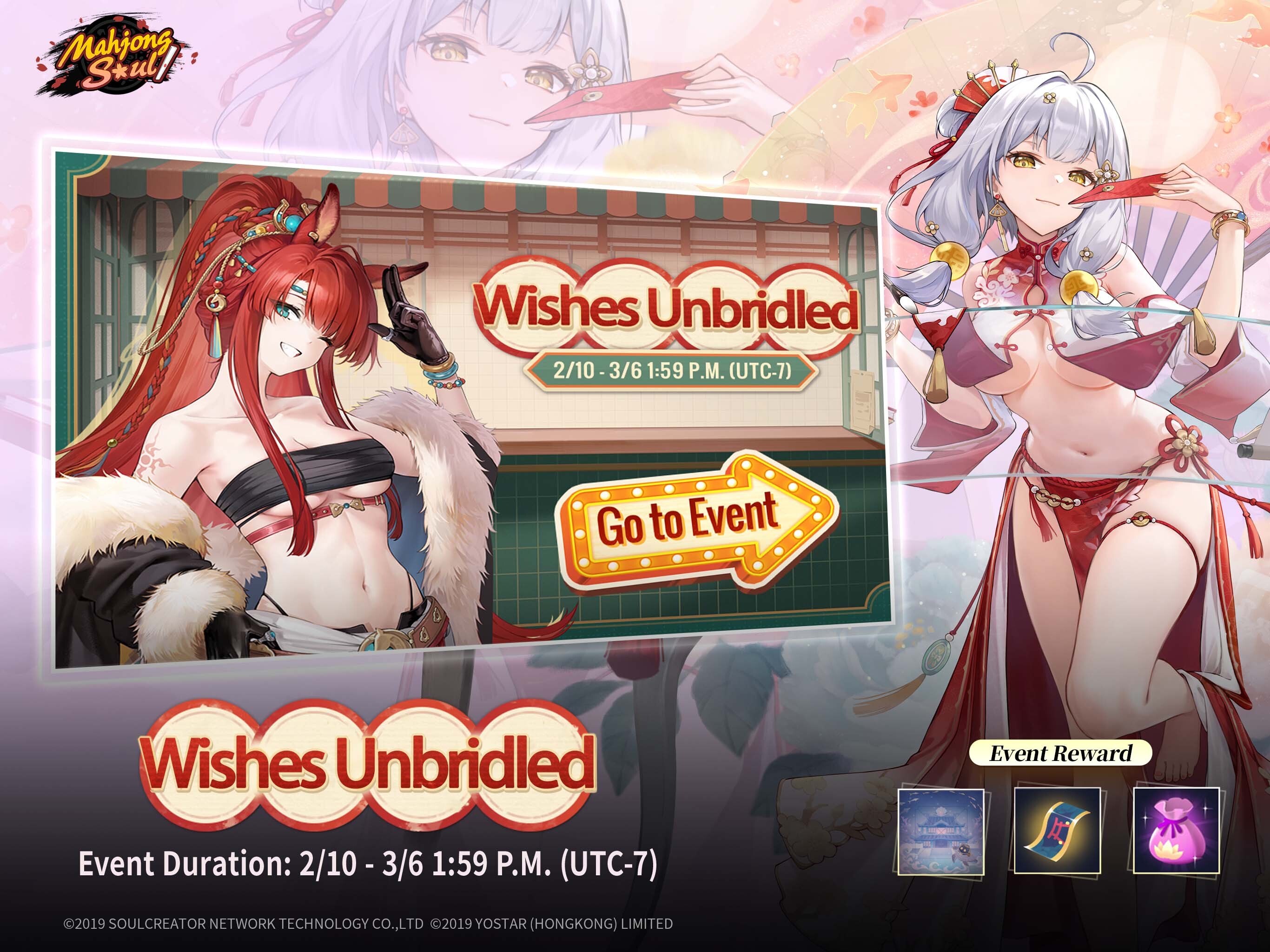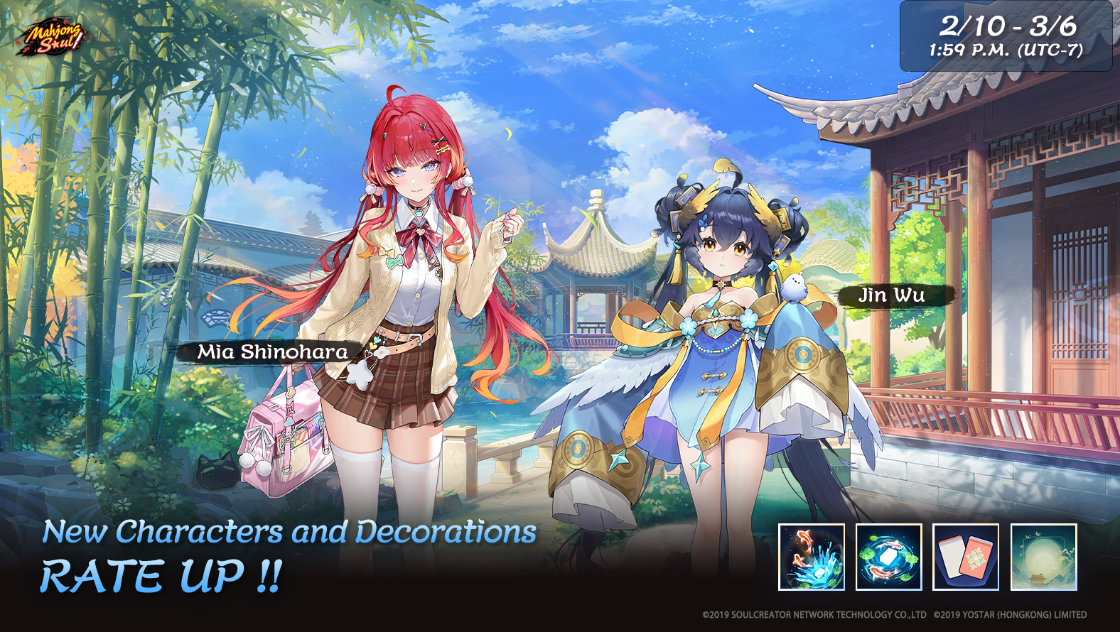 1. New Event: Wishes Unbridled1) Event Period: 2/10 after maintenance – 3/6 1:59 P.M. (UTC-7)2) Event Details: To gather wishes and hone her skills, Chi Lin, Lady of the Horse Palace, is dashing through the streets of One Han City to deliver delicious treats! Clear mahjong obstacles along the way to collect Chi Lin's favorite Carrots and boost her Gallop Power, carrying her message as far as you can! During the event, complete missions and play the minigame to earn various rewards, including Spring Festival Emotes, exclusive Tablecloth, Summon Scrolls, Spring Festival Illustration, Event Illustration, and more!*More details can be found on the event page.*Spring Festival Emotes do not include collab characters; the emotes will be unavailable after 3/10 at 1:59 P.M. (UTC-7).*Excluding matches against AI.*Limited Event Illustration can only be obtained during this event and will not be available in the Illustration Shop roster after the event period.2. Limited-Time Summon Update1) New Characters: Mia Shinohara, Jin Wu.2) I. Sakura Bloom I Limited-Time Rate Up: 2/10 after maintenance – 3/6 1:59 P.M. (UTC-7), Mia Shinohara rate up.II. Sakura Bloom II Limited-Time Rate Up: 2/10 after maintenance – 3/6 1:59 P.M. (UTC-7), Jin Wu rate up.3) New Special Effects and Decorations\[Riichi - Dance of the Koi], \[Winning - Golden Leap], \[Tablecloth - Moon at the Eaves], and \[Tile Back - Countless Springs]3. Limited Summon: Fated Summon1) Event Period: 2/10 after maintenance – 3/6 1:59 P.M. (UTC-7)2) In Fated Summon, you can select any unowned character from Sakura Path or Bamboo Path as a rate-up character. During the event, your chosen character, along with special effects and decorations, will have a limited-time rate up! You can change your chosen character freely before the event closes. Once the chosen character has been obtained through the Fated Summon, access to this event will be closed.4. Limited Summon: Spring's Bounty1) Event Period: 2/10 after maintenance – 3/6 1:59 P.M. (UTC-7)2) During Spring's Bounty, your selected pair of characters, along with special effects and decorations, will have a limited-time rate up! There is no limit to the number of times you can change your Rate Up pair or summon for the selected characters."Spring's Bounty: Sakura" Selectable Pairs:Fu Ji & Eve KristChiori Mikami & Kana FujitaYui Yagi & SaraKaavi & RanseiMila & Nanaha OnoderaMai Aihara & CynthiaSawako Kitami & JaneKaguyahime & Chihori TerasakiLin Lang & NadeshikoYuan Xiao & Nana ShiraishiLeia & Qing LuanAyako Morikawa & MiraiReina Nanami & YuzuEliisa & Hana NinomiyaHinata Takanashi & Fuyumi ShinomiyaXenia & Kirara FujimotoAnju Suzumiya & Ayane KisaragiHua Yubai & Hua YuqingHaruna Igarashi & Riu KujouMomo Hina & Hibiki HimekawaCiri & Hannah"Spring's Bounty: Bamboo" Selectable Pairs:Wanjirou & ZechsA-37 & JuRyan & EinSora Ichinose & Qi XiKutsuji & JosephLing & Osamu SaitouUsumi Ishihara & Yuan FengSammir & Ren KisaragiNatsuhiko Takigawa & Fei MingHideki Akechi & Natsuki ShinomiyaSaturne & Zan TsukimiMusa & Hokuraku*The special effects and decorations will be UNAVAILABLE to obtain after 3/6 at 1:59 P.M. (UTC-7).*You can check the rate of characters and decorations in the corresponding Summon - Details.5. New & Rerun Outfits1) Available Period: 2/10 after maintenance – 3/6 1:59 P.M. (UTC-7)2) Limited-Time New Outfits in Outfit Shop\[Joy Woven In - Fu Ji [b](Animated)[/b]], \[Joy Woven In - Eve Krist [b](Animated)[/b]], \[Joy Woven In - Ju [b](Animated)[/b]].3) Limited-Time Rerun Outfits in Outfit Shop \[Echoes of Rejoicing - Kana Fujita [b](Animated)[/b]], \[Echoes of Rejoicing - Sara], \[Echoes of Rejoicing - Chiori Mikami], \[Echoes of Rejoicing - Zechs [b](Animated)[/b]].4) New Background in Background Shop: \[Rippling Green].*You need to have the character to equip their outfit(s).*You can check currently owned outfits in Item - Outfit.*The animation effect of the Animated Outfits can be turned on/off in Dorm; the animation effect is not supported in some interfaces.*You can go to Dorm - Character - View and click the character's avatar to change the outfit.6. New Illustration and StoryNatsuki Shinomiya's story has been added to Dorm. Check the character in Dorm and click View - Story to see the contents and get rewards. You can unlock Story by leveling up Bond.Unlock the endings to collect rewards, including the Character's Illustration, Summon Scroll, and Sunshine Lucky Bag.7. Others1) Added a new \[Four-Player Riichi] voice line for all characters (including collab characters);2) Fixed display issues with certain visual effects during matches.