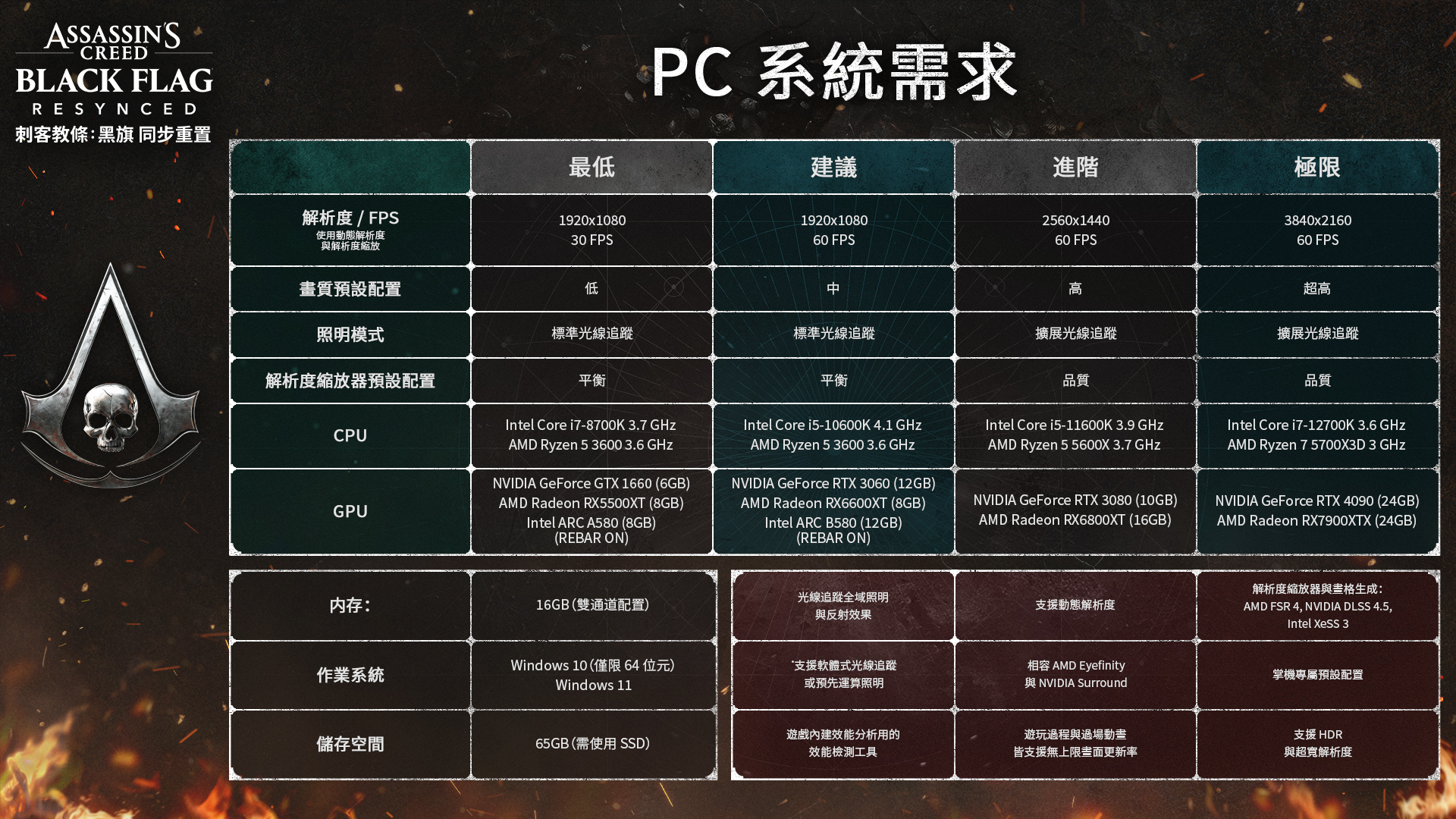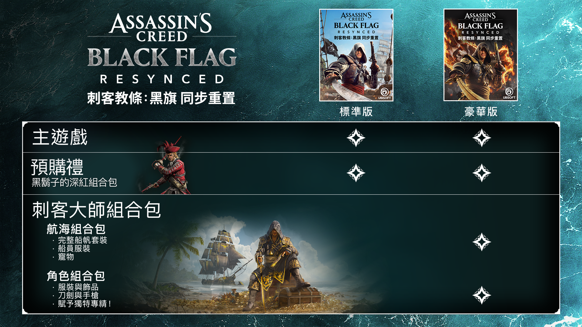 《刺客教條:黑旗 同步重置》終於近在眼前。我們整理了你在與「寒鴉號」船長「愛德華.肯威」一同踏上加勒比海冒險之前所需的所有關鍵資訊。我們會分享涵蓋 Steam 上市資訊、全新內容、PC 系統需求等重點,帶你一次了解所有你需要知道的事情。《刺客教條:黑旗 同步重置》上市日期「愛德華.肯威」將隨《刺客教條:黑旗 同步重置》在 2026 年 7 月 9 日上市時回歸。《同步重置》距離原作推出已過 13 年,是一款忠實重現《黑旗》的重製作品,採用最新版 Anvil 引擎打造,帶來多項改進與全新內容,並由 Ubisoft 新加坡工作室主導開發,同時也有多位原班開發成員回歸,讓作品全面進化至最新世代硬體標準。你將再次回到加勒比海,化身「寒鴉號」的船長,體驗火爆刺激的海戰,以全新強化的「招架」導向戰鬥系統展開殘酷的劍鬥,享受全面升級的視覺表現,感受栩栩如生的美麗熱帶環境,並暢享更多內容。你將隨著「愛德華.肯威」的腳步,從私掠者一路成長為技藝高超的刺客,並與聖殿騎士正面對抗。在最新技術與充滿熱情的開發團隊加持下,你將再次體驗愛德華的故事,且置身在一個空前沉浸、寫實的遊戲世界。7 月 9 日起,你可透過 Steam 與 Steam Deck 再次(或首次)體驗愛德華的故事。Steam Deck 版本的更多細節將於日後公布。現在就搶先了解並親眼見證遊戲實機內容:全球情報揭露發表會——自 4 月 23 日起,由愛德華.肯威原始配音員 Matt Ryan 主持,他也為《同步重置》錄製了全新台詞。發表會將展示遊戲內容、全新玩法特色、開發者訪談等精彩內容。全球首發預告片——觀看預告片,初次認識(或再次重溫)愛德華的冒險。官方遊戲概覽預告片——深入了解《同步重置》版本將帶來的完整體驗。務必觀看發表會,為愛德華.肯威回歸而量身創作全新音樂曲目的 Woodkid 有特別的話想向大家分享。《刺客教條:黑旗 同步重置》有哪些全新內容?《同步重置》保留了你所熟知並熱愛的《黑旗》故事,同時 Ubisoft 團隊也在整體體驗中加入了全新內容與多項改進項目。以下是部分《同步重置》的新增與改進內容:畫面與技術強化以 Ubisoft 最新進化版本的專有 Anvil 引擎從頭到尾全新打造(此引擎同樣用於《刺客教條:暗影者》)支援光線追蹤全域照明(RTGI)與反射效果全新重建的美術素材,完整支援微多邊形與物理式運算(PBR)流程全面現代化的水體運算技術與模擬系統全新與強化的功能、任務與故事內容尋找並指派全新的「船副」加入「寒鴉號」,每位船副都能為海戰帶來獨特能力「沙灘」上相關的遊戲內容已重新設計,為地圖各處的島嶼帶來全新獎勵與獨特遭遇新增任務與全新過場場景,由愛德華原始配音員 Matt Ryan 與原班演出陣容回歸獻聲為「寒鴉號」提供更多自訂選項,包括全新外觀,以及全新的船上寵物,讓你在航行時帶上貓咪或猴子作伴重新設計的「肯威的艦隊」,可使用俘獲的船隻透過稀有活動與貿易產生被動收入;現已可於「船長室」與《刺客教條:黑旗 同步重置》的所有版本中使用經典船歌全面回歸,並加入全新 10 首歌曲,讓你的船員在航行時放聲高歌重新打造的動作冒險遊戲戰鬥系統,包含:全新、更加震撼的擊倒動作全新的「招架」機制繩鏢與手槍的快速射擊動作全新敵人類型「爆破兵」全新與強化的匿蹤玩法「觀察模式」,可延伸愛德華的「鷹眼視覺」可隨處蹲下,讓愛德華能在陸地上的任何位置降低存在感可隨處潛水,讓愛德華能悄悄接近海岸地點與船隻陰影與低光源將在匿蹤過程中影響愛德華的可見度重新設計的海戰系統新增多種次要武器可於戰鬥中使用,包括:「碎片桶」可引爆並破壞敵方船帆「八磅砲」可在敵方船體上製造更多弱點依據敵方陣營重製敵方船隻與陣營配置,加入不同裝備差異強化後的跑酷系統,包含以下動作:手動跳躍側蹬跳躍後蹬跳躍,可用來提升高度跑酷動作之間更迅速的中斷銜接動態天氣與物件透過 Anvil 的「Atmos」系統,加勒比海的天氣將有著不同以往的存在感,能讓海域真正活起來可破壞物件會回應天氣與戰鬥:招牌隨風擺動、船帆鼓起翻飛、風暴中椰子在地面滾動,敵人撞上物件時也會將物件擊碎重新設計的水體物理效果,真正帶出航行於加勒比海的臨場感未來幾週,我們將透過專題文章,進一步深入介紹重製版在各個面向的玩法與改進內容。《刺客教條:黑旗 同步重置》PC 系統需求做好萬全準備,啟航在即——了解《刺客教條:黑旗 同步重置》的完整 PC 系統需求與最低需求。你至少需要連線至網際網路一次以下載遊戲,但完整遊戲體驗可在離線狀態下進行。《刺客教條:黑旗 同步重置》採用經過最佳化、具備高度擴展性的引擎,並提供多種選項供 PC 玩家依需求調整。遊戲支援最新的解析度縮放與畫格生成技術。同時,低階裝置也能透過高效率的軟體式光線追蹤選項,在未支援硬體加速光線追蹤的 GPU 上體驗進階光照效果。此外,遊戲亦提供專為掌機打造的圖形預設配置。1920x1080、30 FPS、「低」預設配置、「標準」光線追蹤、「平衡」解析度縮放器:最低系統需求[expand type=details expanded=true]CPUIntel Core i7-8700K 3.7 GHz、AMD Ryzen 5 3600 3.6 GHzGPUNVIDIA GeForce GTX 1600(6GB)、AMD Radeon RX 5500 XT(8GB)或 Intel ARC A580(8GB)RAM16GB(雙通道配置)儲存空間65GB(需使用 SSD)作業系統Windows 11[/expand]1920x1080、60 FPS、「中」預設配置、「標準」光線追蹤、「