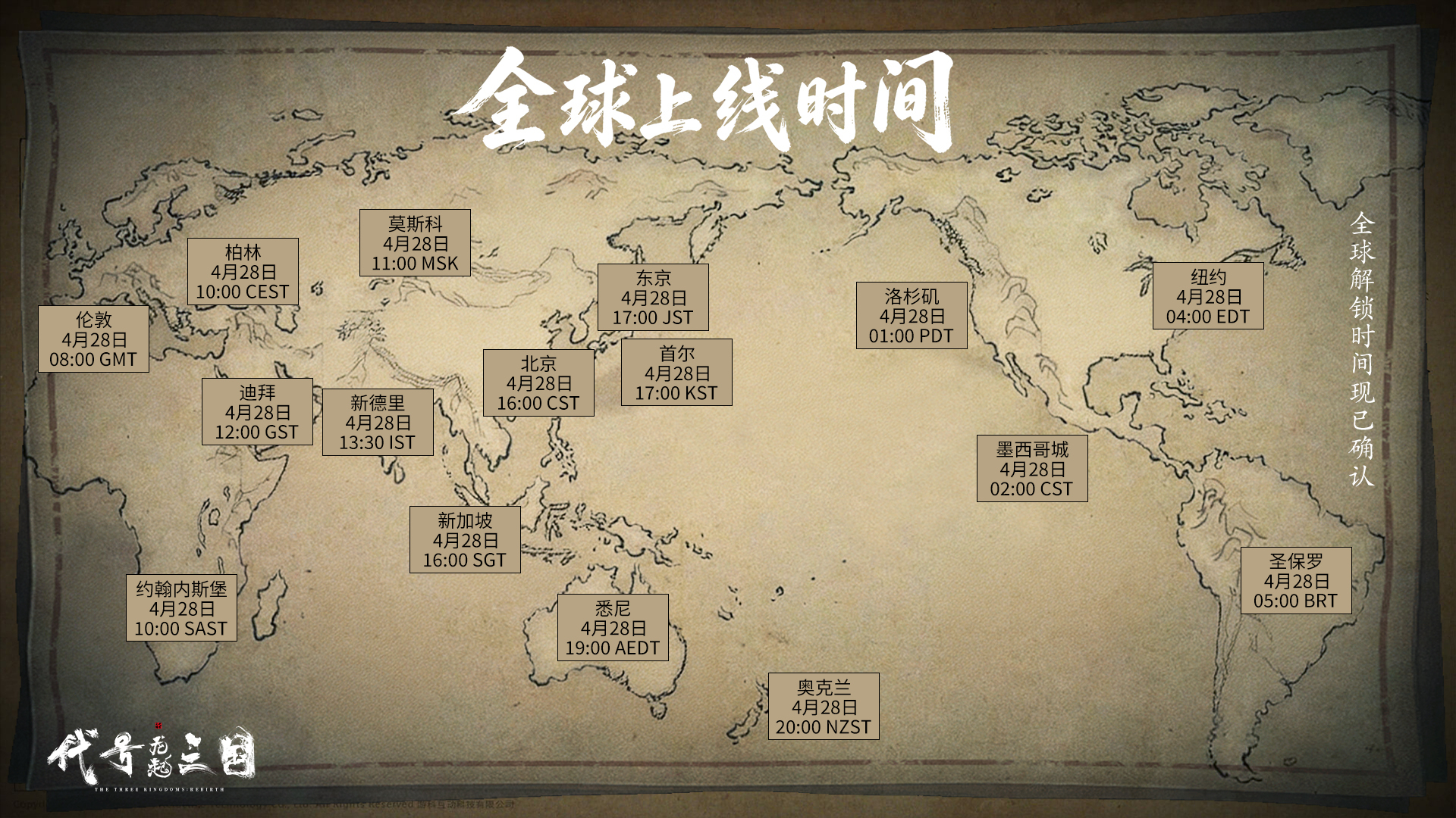 遊戲將於北京時間 (CST, UTC+8) 16:00 正式解鎖,全球各主要時區同步上線:美西 PDT (UTC-7) 1:00、美東 EDT (UTC-4) 4:00、巴西 BRT (UTC-3) 5:00、英國 GMT (UTC+0) 8:00、歐洲 CEST (UTC+2) 10:00、莫斯科 MSK (UTC+3) 11:00、杜拜 GST (UTC+4) 12:00、印度 IST (UTC+5:30) 13:30、日本 JST (UTC+9) 17:00、韓國 KST (UTC+9) 17:00、澳洲 AEDT (UTC+11) 19:00、紐西蘭 NZST (UTC+12) 20:00。無論晝夜,全球玩家皆可同步入局。