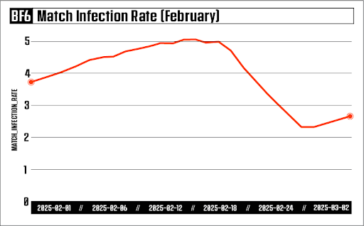 你好,士兵!又過了一個月,我們又要來分享與《戰地風雲 6》作弊者對抗的進展。2 月:結果和影響對戰感染率 Match Infection Rate(MIR):對戰中至少受到一名作弊者負面影響的百分比。這包括所有可疑的作弊者,甚至包括那些我們沒有足夠的證據來強制懲處的人。在 2 月,MIR 從 3.72% 開始。此比例持續增加,直到在 15 日達到 5.01% 的最高值。這時候,我們已經開始實行新的偵測與加速方法,並對接下來數週的作弊者數量造成重大影響。我們在 25 日達到最低值 2.30%,然後此比例又開始逐漸上升,因為作弊程式開發人員開始回應我們的行動。在一月期間,EA Javelin 反作弊系統成功阻止了 256,263 次企圖作弊或篡改遊戲的行為,防止其影響比賽進行。我們仍在持續追蹤 226 個與作弊相關的程式、硬體方案、廠商、經銷商及其相關社群。其中,目前已有 217 個(占96.01%)回報功能失效、偵測警告、停機,或直接將其作弊工具下架。我們將會持續審閱您的問題和意見回饋,並將在大約一個月後分享二月的數據。一起維持遊戲的公平性,我們戰場上見。