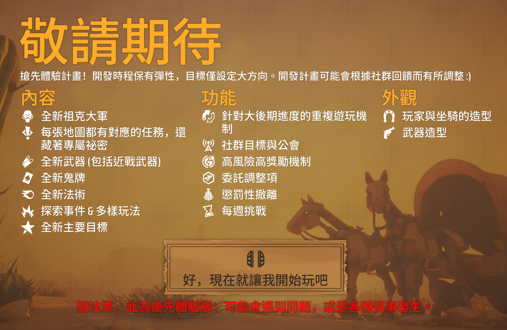A: 牛仔們,搶先體驗版只是這場西部之旅的開始!曾經和大家預告過的全新地圖【地獄火】,以及全新敵人外星人派系【祖克大軍】很快就會和大家見面!更多武器(包括近戰武器!)、更多法術和鬼牌、新主線任務、豐富的中後期機制……這些都已經在我們的計劃中!