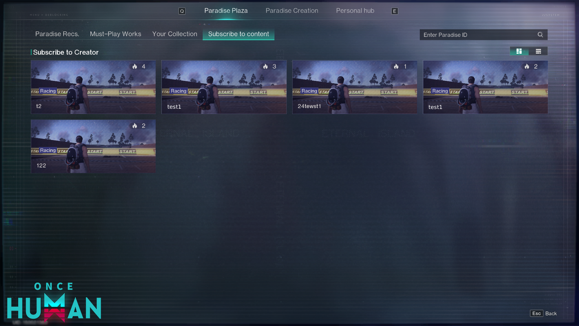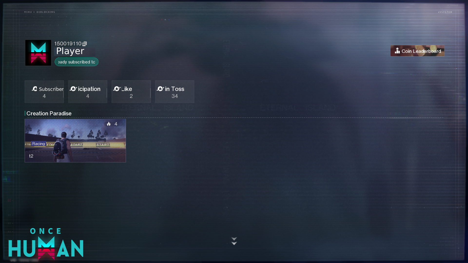 親愛的超越者:自環島樂園開放線上共研測試以來,我們收到了數千條相關回饋。非常感謝超越者們對環島樂園的熱切關注和真誠建議,你們的每一條回饋,都是我們持續優化遊戲的核心動力。經過對大家建議的系統性梳理與深度調研,在經歷了緊張的開發和迭代後,永恆島【環島樂園】將於2月5日(UTC+8)進行優化和更新。本次我們將聚焦於玩家高頻反饋的「環島樂園玩法不足」這一體驗問題,在環島樂園中追加了新的設施與玩法,期望為超越者們帶來更有趣的自訂內容。我們誠邀各位成為新樂園的體驗者,共同體驗創作的樂趣! 環島樂園進入方式點擊主介面(PC:ESC介面,行動版:選單按鈕-永恆島按鈕)在永恆島中選擇環島樂園,即能建立自己的樂園、參與他人建立的樂園玩法。 一、新增玩法:捉迷藏捉迷藏玩法中,可以建立一個捉迷藏的小屋或者街道,一方玩家變身為各式各樣的物品,另一方玩家需要找出變身者,最後生存下來的一方獲得勝利。 建立玩法時,超越者可以看見新增的玩法:捉迷藏選擇【啟動創作】,即可開始建造二、新增設施設施類型 名稱設施功能通用設定陣營出生點設置後,對應陣營玩家在此處出生。通用設定陣營復活點對應陣營玩家路過後啟動,死亡後在該處重生。通用設定陣營終點陣營終點,對應陣營玩家觸碰即達成目標。通用設定文字觸發器可配置一段文字,玩家踩踏後觸發,可限定能看見的玩家陣營與可見次數。賽道設施賽道路徑點小型擺下後,成為玩法的路徑點。玩法中的所有路徑點應當至少有一個連接到起點,另一個連接終點,線路完整時生效。賽道設施賽道路徑點中型擺下後,成為玩法的路徑點。玩法中的所有路徑點應當至少有一個連接到起點,另一個連接終點,線路完整時生效。賽道設施賽道路徑點大型擺下後,成為玩法的路徑點。玩法中的所有路徑點應當至少有一個連接到起點,另一個連接終點,線路完整時生效。捉迷藏設施陣營變身器指定陣營與變身時機,觸發後玩家將幻化為預設模型。捉迷藏設施陣營黑屏器指定陣營與黑屏時機,觸發後玩家將在指定時機內維持黑屏。捉迷藏設施隨機武器箱指定陣營與武器,玩家打開箱子後可隨機獲取箱中武器。玩家所獲武器僅限本局使用。捉迷藏設施隨機道具箱指定陣營與道具,玩家開啟箱子後可隨機獲取箱中道具。玩家所獲道具僅限本局使用。三、新增功能:創作訂用進入創作者首頁可以訂用該創作者,訂用後可查看到訂用創作者的新作品。四、新增功能:樂園投幣在玩法詳情頁面可以給創作者投環島樂園幣,投幣後可以提升創作者玩法在首頁的展示權重,增加喜愛的作者的曝光!透過每日遊玩樂園、發布樂園、完成樂園挑戰、從其他玩家處獲得投幣均能獲得環島樂園幣哦~歡迎積極進行樂園的建設與遊玩。 五、新增功能:個人中心新增樂園個人中心,個人中心中可查看自己的資訊並進行樂園挑戰【我的名片】:顯示我的個人資訊【我的訂用】:顯示我訂用的創作者【樂園挑戰】:透過達成每週挑戰獲得額外獎勵  以上就是環島樂園的更新內容。除了上述內容外,我們也正在梳理永恆島、創世服中玩家的可自訂內容,並進行全方位的重構,希望可以帶來一個更自由、易用的創作樂園。其中的進展,我們會及時透過開發公告的方式和超越者們進行同步,並持續徵集大家的精彩創意。感謝所有超越者的關注和遊玩! 《Once Human》項目組