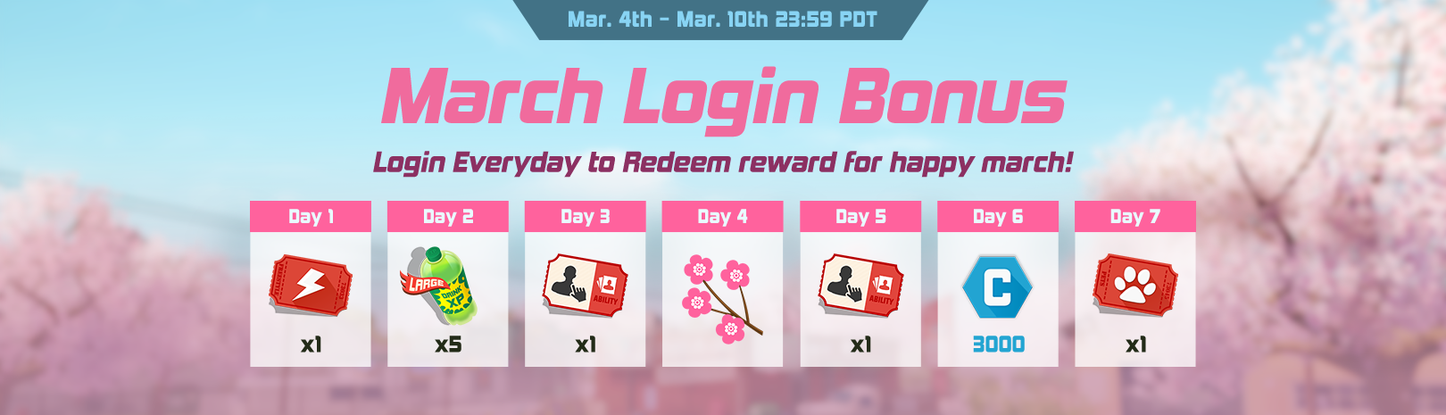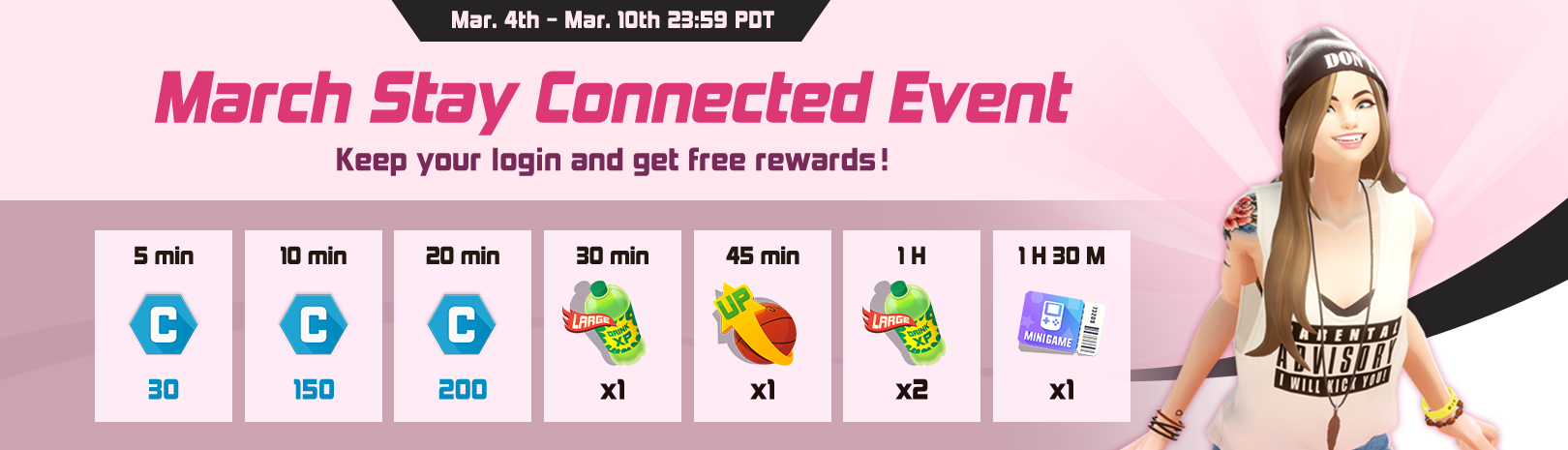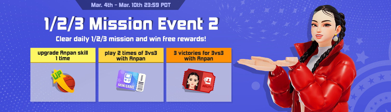 Greetings, FS City Ballers!Our brand-new events are kicking off this week, and we can’t wait for you to dive in! Team up with your friends, hit the court together, and share the hype with everyone![color=pink]1. March Login Bonus Event[/color][color=yellow]Event Duration: 03/04 - 03/10 23:59 PDT[/color]A special spring gift has arrived! Log in every day and receive a variety of rewards.[color=pink]2. March Stay Connected Event[/color][color=yellow]Event Duration: 03/04 - 03/10 23:59 PDT[/color]Stay online during the event and earn special rewards!The more time you spend in-game, the more plentiful rewards await you.* Your total daily connection time will be counted, and it resets at 00:00 (PST) every day.* Rewards can be claimed on the event page and will be sent to your mailbox.[color=pink]3. Pink Collection Shopping Bag[/color][color=yellow]Event Duration: 03/04 - 03/17 23:59 PDT[/color]Spring celebrating pink outfits have arrived! Discover a variety of charming outfits in the Pink Collection Shopping Bag.[color=pink]4. Spring Flower Bundle[/color][color=yellow]Event Duration: 03/04 - 03/17 23:59 PDT[/color]A bundle filled with the fragrance of spring flowers has arrived! Get a variety of items, including pets and ceremonies, all at once.[color=pink]5. [Discord] Choco Union[/color][color=yellow]Event Duration: 03/04 - 03/17 23:59 PDT[/color]Anpan Special Event #1!If all team members play Anpan and verify it in the Discord event channel, you will have a chance to win prizes through a lucky draw.[color=pink]6. Meow Meow Cat Package[/color][color=yellow]Event Duration: 03/04 - 03/17 23:59 PDT[/color]Check out the Cat Package, where you can obtain an adorable cat set all at once![color=pink]7. 1/2/3 Mission Event[/color][color=yellow]Event Duration: 03/04 - 03/10 23:59 PDT[/color]Anpan Special 1/2/3 Mission Event 2!Complete missions and strengthen Anpan even further.[color=pink]8. [SNS] Dance Challenge: Gimme[/color][color=yellow]Event Duration: 03/04 - 03/17 23:59 PDT[/color]Anpan Special Event #2!Record a video of at least 10 seconds dancing to “Gimme” and upload it to SNS.Participants will have a chance to win a T-shirt and 100 points through a lucky draw.*Gimme YouTube M/V : https://youtu.be/pIfScZGDNsc?si=dxfnElDRoS4P-Qe9[color=orange]- 3on3 Freestyle Team[/color]