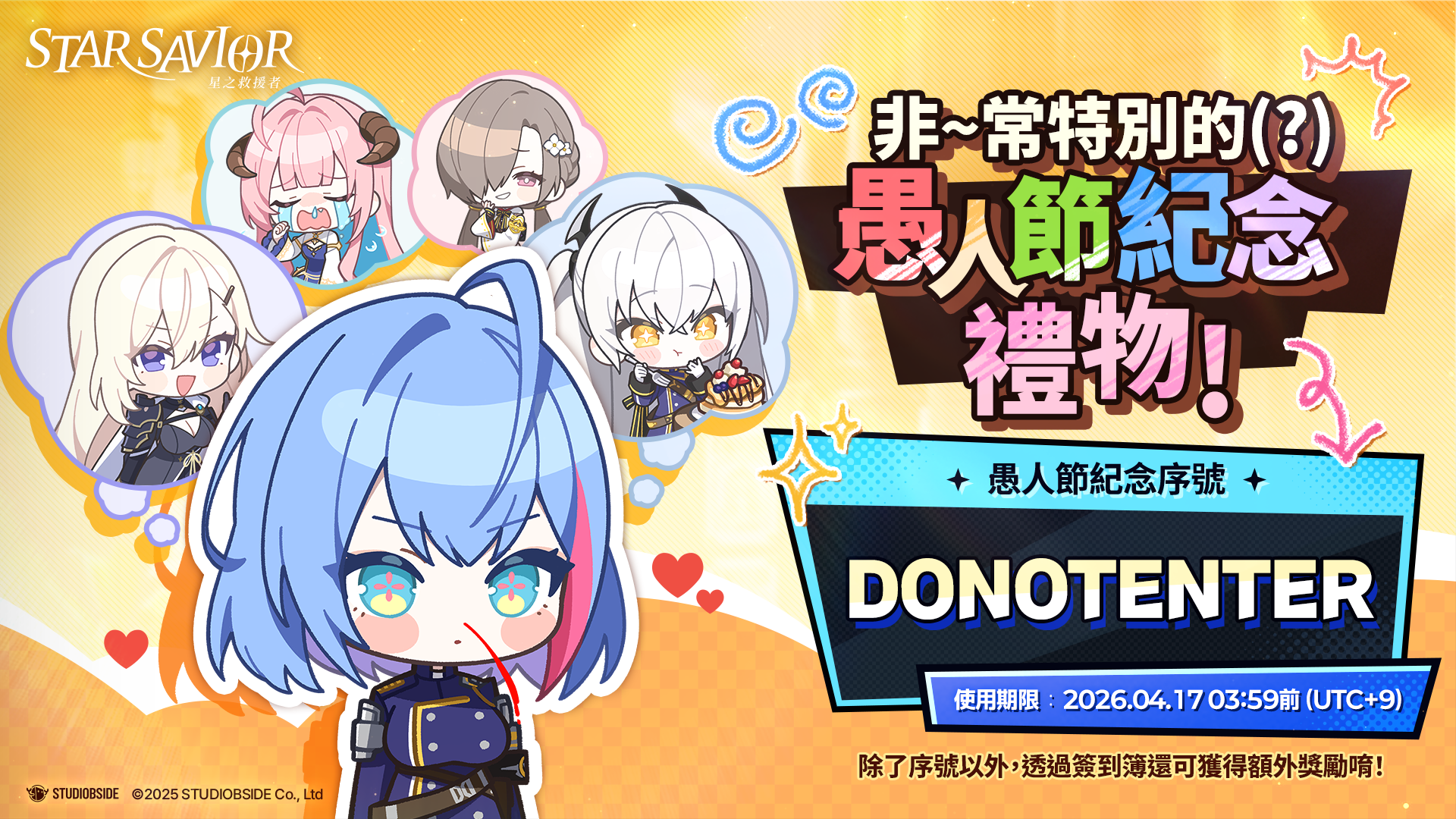 星辰寄宿的救援者育成物語,星之救援者。各位團長好!我是你們的聯絡官,GM 麗莎。團長!你知道今天是什麼日子嗎?為了團長,我們準備了一個可以獲得特別禮物的驚喜活動!雖然是愚人節,但我們對團長的心意可是認真的唷~ ????詳細活動內容請務必查看下方說明!Event 1. 協助特別(?)旅程的全新阿爾克那驚喜登場!只為團長準備的特別(?)阿爾克那——將於4月1日(三) 04:00 (UTC+9)登場!請於指定時間透過以下途徑確認:- 遊戲登入 > 主大廳下方【HOT&NEW】>【愚人節簽到活動】啊~還有! 該阿爾克那的突破任務將於4月2日更新後開放,敬啟期待唷!Event 2. 絕對不要輸入!絕對!我…我已經警告過您了!!絕~~對不要輸入喔!!??✨ 優惠碼 DONOTENTER✨ 優惠碼有效期間- 兌換至 2026/04/17(五) 04:00 (UTC+9) 前截止✨ 兌換方式- 登入遊戲後,點擊右上角【選單】 → 【設定】 → 【帳號管理】 → 【輸入優惠碼】- 於彈出視窗輸入序號後,點擊【確認】即可領取✨ 注意事項- 活動期間每個帳號僅限兌換一次優惠碼。- 獎勵道具將透過遊戲內信件發送。- 郵件自領取日起保留14天,請務必於期限內領取。感謝團長們的喜愛與支持《星之救援者》營運團隊