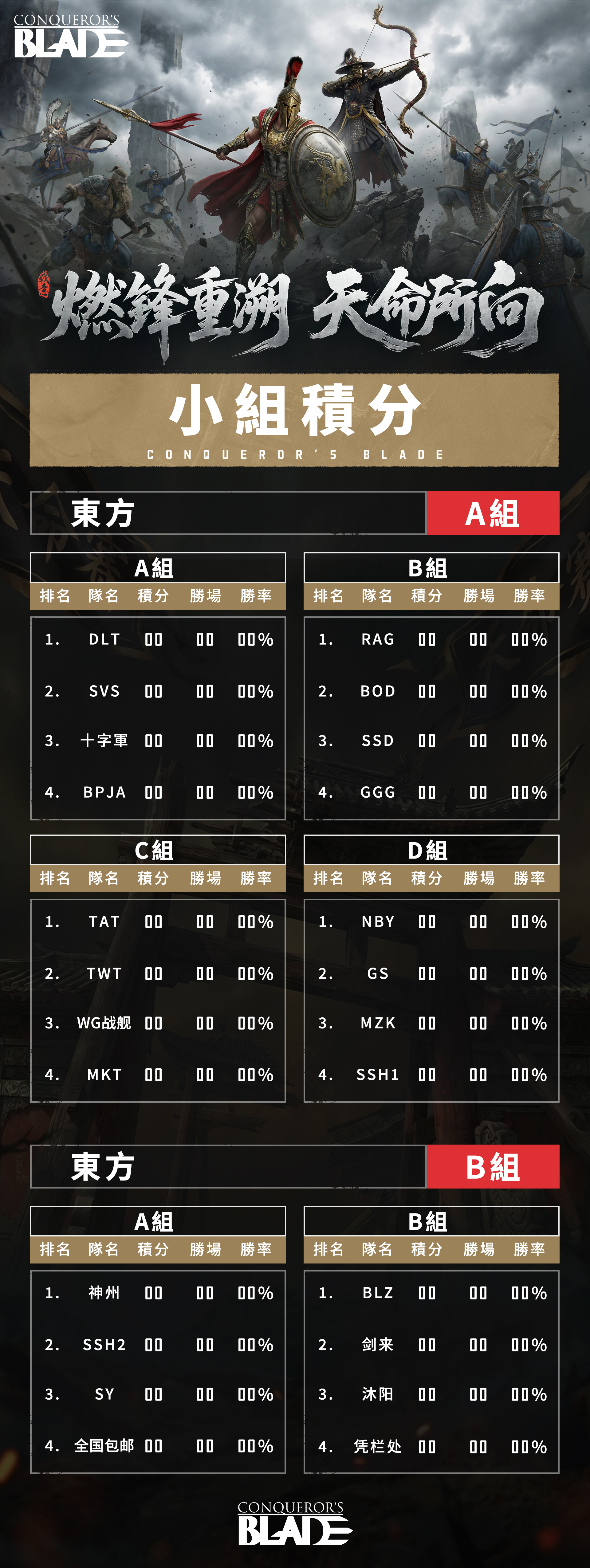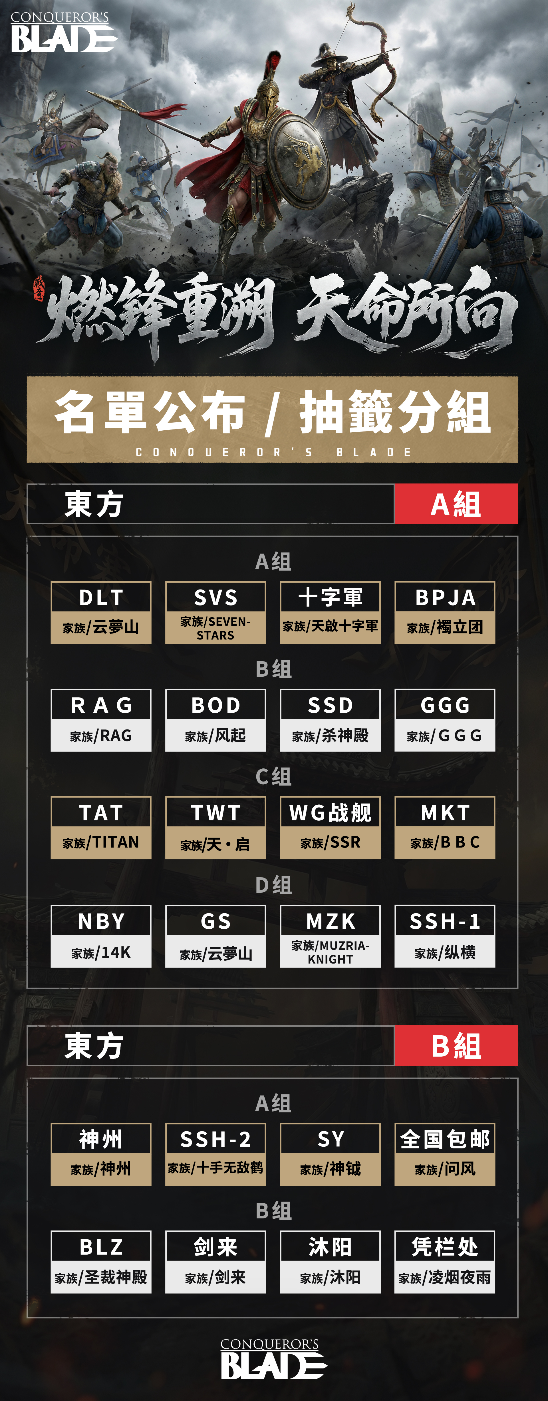 同袍同行,為家族而戰;積分累勝,以結果定名。將軍們好!「2026天命積分賽」後續賽程現已正式公布。根據報名期間伺服器歸屬調整情況,賽事組已同步完成相關賽區名單確認與最終複核。本次公布的賽程及參賽名單資訊,為本屆賽事正式確認版本。後續賽事推進、對陣安排及相關通知,也將統一以本次發布內容為準。隨著名單確認與賽程落位,本屆「2026天命積分賽」也將正式從報名階段進入實戰階段。接下來,真正的較量,即將開始。正式參賽名單以下為「2026天命積分賽」最新確認後的正式參賽名單:東方賽區正式賽程安排以下為本屆「2026天命積分賽」正式賽程安排:各賽區將按既定賽制獨立推進後續比賽安排,包括小組賽、積分累計、晉級流程及更高階段的交流賽對決。請各位參賽家族務必及時查看所屬賽區的比賽時間、場次安排及後續通知內容,提前完成隊伍集結、人員確認與戰術準備。請以本次公布版本為準如對賽區歸屬、參賽名單或賽程安排仍有疑問,請及時在官方賽事答疑群內與賽事管理員溝通確認。名單已定,賽程已出。從這一刻開始,本屆「2026天命積分賽」也將正式進入對抗階段。對於所有關注本屆賽事的將軍來說,也終於到了可以正式圍觀這場大戰的時候。接下來,就讓我們把答案交給賽場。