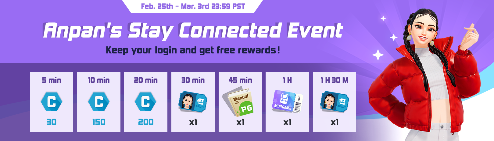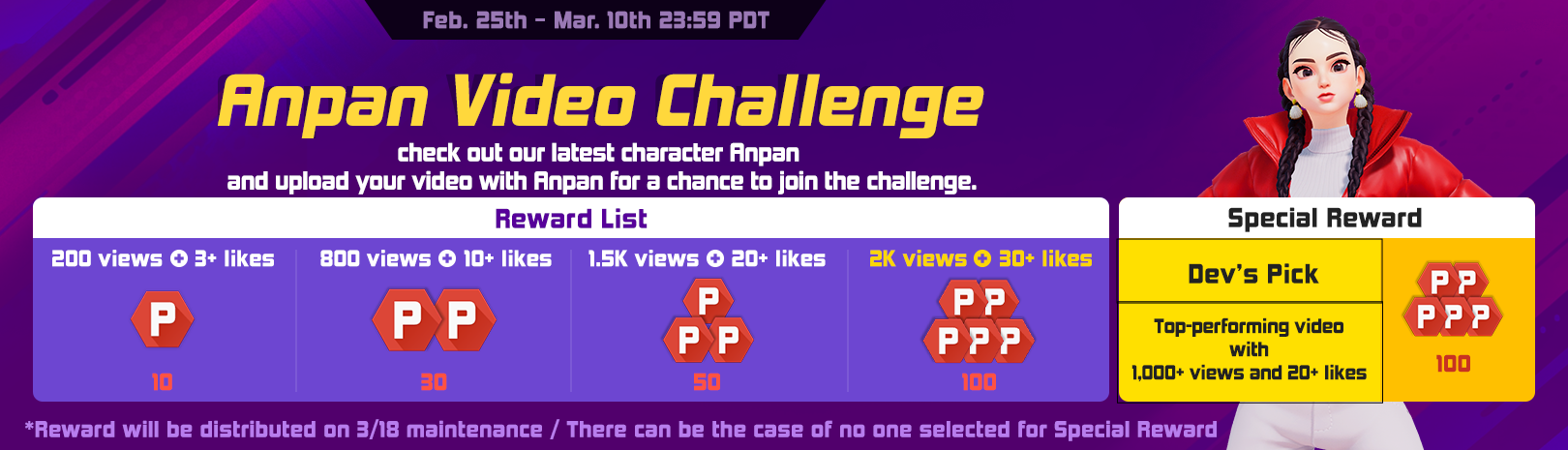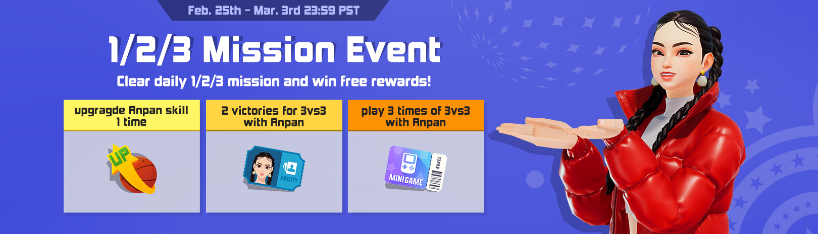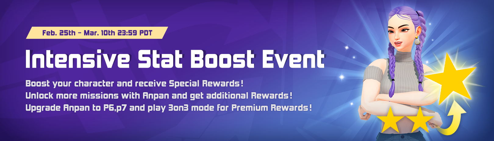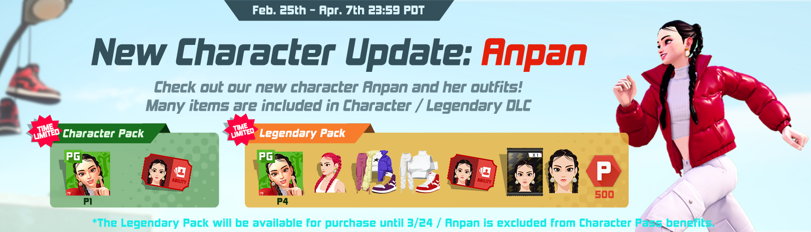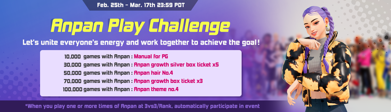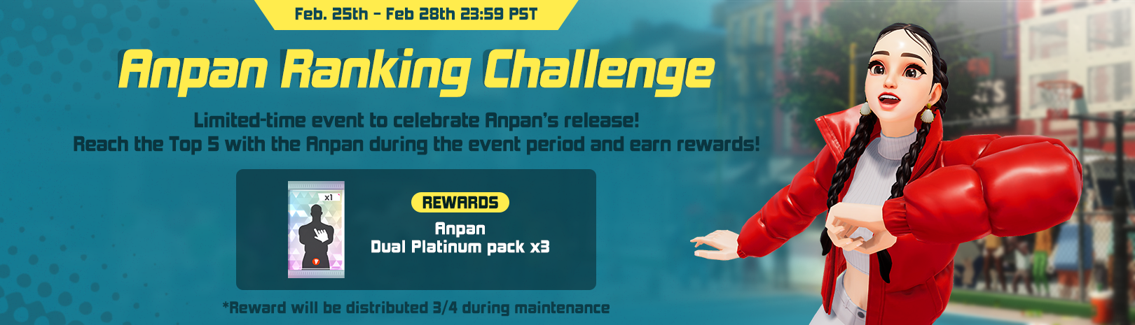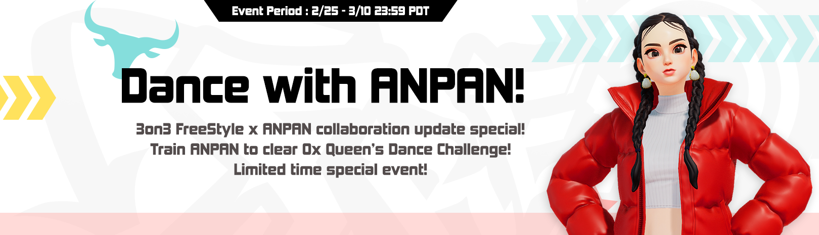 Greetings, FS City Ballers!Real-Life figure dives into the 3-on-3 FreeStyle world!3on3 FreeStyle x ANPAN special collaboration update!Check out what kind of exciting event is ongoing with ANPAN![color=darkorange]1. Dance with ANPAN![/color][color=yellow]Event Duration: 02/25/2026 - 03/10/2026 23:59 PDT[/color]3on3 FreeStyle x ANPAN collaboration update special!Train ANPAN to clear the Ox Queen’s Dance Challenge!Limited-time special event!During the event period, the mini-game rewards will be changed.For detailed rates and items, please refer to the draw table.[color=limegreen]Link[/color]: https://3on3.fsgames.com/newNews/drawRate/6589/viewEnjoy the mini-game with Anpan and earn rewards for her![color=darkorange]2. Anpan’s Boost Login Event[/color][color=yellow]Event Duration: 02/25/2026 - 03/03/2026 23:59 PST[/color]The newly updated character Anpan has arrived!Play the game and receive items for Anpan.[color=darkorange]3. Anpan’s Stay Connected Event[/color][color=yellow]Event Duration: 02/25/2026 - 03/03/2026 23:59 PST[/color]Stay online during the event and earn special rewards!The more time you spend in-game, the more plentiful rewards await you.[color=orangered]Note[/color][color=crimson]*[/color] Your total daily connection time will be counted, and it resets at 00:00 (PST) every day.[color=crimson]*[/color] Rewards can be claimed on the event page and will be sent to your mailbox.[color=darkorange]4. New Character Update: Anpan[/color][color=yellow]Event Duration: 02/25/2026 - 04/07/2026 23:59 PDT[/color]The new character Anpan has arrived!Check out a bunch of times for her with character and Legendary DLCs![color=orangered]Note[/color][color=crimson]*[/color] Anpan is excluded from Character Pass benefits.[color=orangered]Time limited DLC Sales Period:[/color][color=crimson]*[/color] Anpan Character Pack: February 25 – April 7, 23:59 PDT[color=crimson]*[/color] Anpan Legend Pack: February 25 – March 24, 23:59 PDT[color=darkorange]5. Anpan Management Package[/color][color=yellow]Event Duration: 02/25/2026 - 03/10/2026 23:59 PDT[/color]Two special management packages just for Anpan are now available!Purchase and power up Anpan faster than ever![color=darkorange]6. Anpan Play Challenge[/color][color=yellow]Event Duration: 02/25/2026 - 03/17/2026 23:59 PDT[/color]Play Anpan together and earn rewards!Work together to unlock various rewards, including outfits.[color=darkorange]7. Intensive Stat Boost Event[/color][color=yellow]Event Duration: 02/25/2026 - 03/10/2026 23:59 PDT[/color]Level up Anpan and reach P6 and P7 grades to earn valuable rewards during the event![color=darkorange]8. 1/2/3 Mission Event[/color][color=yellow]Event Duration: 02/25/2026 - 03/03/2026 23:59 PST[/color]Anpan Special 1/2/3 Mission Event!Complete missions and strengthen Anpan even further.[color=darkorange]9. Anpan Growth Box Promotion[/color][color=yellow]Event Duration: 02/25/2026 - 03/10/2026 23:59 PDT[/color]Purchase Anpan Growth Boxes with Points and receive Ticket Paybacks!Don’t miss out on the EXP boost included![color=darkorange]10. Anpan’s Choco Diary[/color][color=yellow]Event Duration: 02/25/2026 - 03/10/2026 23:59 PDT[/color]A collection of perfect-match items for Anpan!Let’s play 3on3 with Anpan and her special Choco Diary![color=darkorange]11. Anpan’s Special Mission[/color][color=yellow]Event Duration: 02/25/2026 - 03/10/2026 23:59 PDT[/color]Clear Anpan’s Intensive missions and earn a variety of rewards![color=orangered]Note[/color][color=crimson]*[/color] Make P7 Anpan : Intensive note x10.[color=crimson]*[/color] Play 20 times with intensive Anpan(3vs3/rank) : Anpan Growth Box Ticket x5, Intensive note x10.[color=darkorange]12. Anpan Video Challenge[/color][color=yellow]Event Duration: 02/25/2026 - 03/10/2026 23:59 PDT[/color]Upload a video featuring Anpan and take part in the challenge!Check out this link for further details:https://store.steampowered.com/news/app/1292630/view/494969887019499619?l=englis[color=orangered]Note[/color][color=crimson]*[/color] Rewards will be distributed during the March 18 maintenance.[color=crimson]*[/color] Special Rewards may not be granted if no suitable entries are selected.[color=darkorange]13. Anpan SNS / Discord Event[/color]Celebrate the Anpan collaboration with special community events!Cheer for Anpan and earn various rewards.[color=yellow]Event Duration[/color][color=crimson]*[/color] Anpan Support Event (SNS): Feb 25 – Mar 4, 16:59 KST.[color=crimson]*[/color] Show My Anpan (Discord): Feb 25 – Mar 11, 15:59 KST.[color=darkorange]14. Achieving TOP 3! Event[/color][color=yellow]Event Duration: 03/01/2026 - 03/31/2026 23:59 PDT[/color]The ranking event returns!Achieve TOP 3 ranking for each character and earn a Dual Platinum Pack for that character.[color=darkorange]15. Anpan Ranking Challenge[/color][color=yellow]Event Duration: 02/25/2026 - 02/28/2026 23:59 PST[/color]Anpan Collaboration Special Event!Reach TOP 5 with Anpan and earn exclusive r