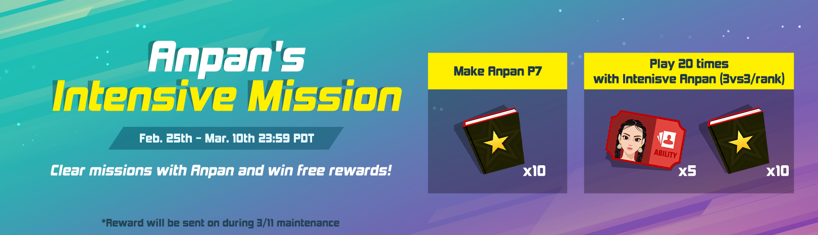 [color=crimson]*[/color] Play 20 times with intensive Anpan(3vs3/rank) : Anpan Growth Box Ticket x5, Intensive note x10.