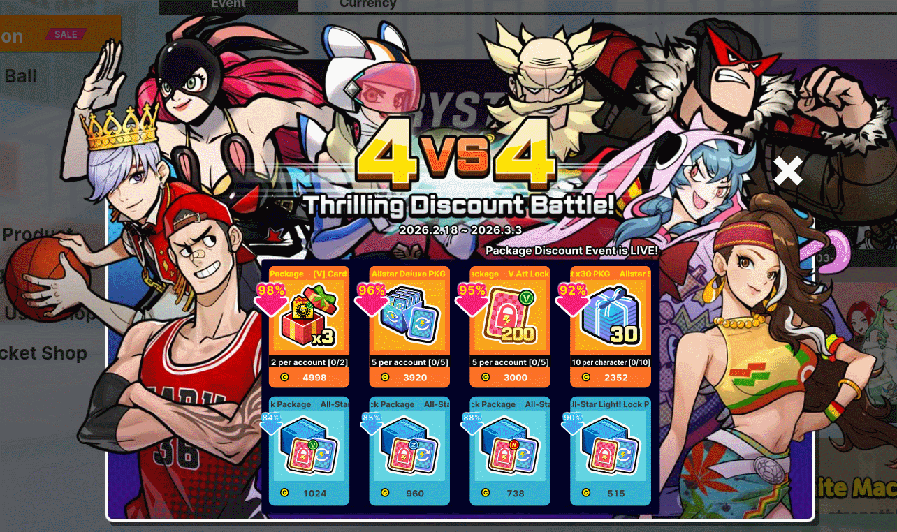 Hello Ballers!Arm yourselves for another Discount Battle! [color=orange]4:4 Special Discount Event[/color] is here with exciting new goodies to grab! Be quick to grab this limited-time offer and refine yourself at a lower cost! [color=yellow]Event Period:[/color]2026/02/18 ~ 03/03 23:59 (PST)[color=limegreen]Note:[/color] Please be aware that Event Gkash cannot be used during this exciting Thrilling Discount Battle.Grab these amazing deals before they’re gone and level up your game with fantastic savings!Thank you for your continued support.[color=orange]- FreeStyle2 Team[/color]