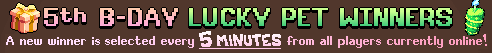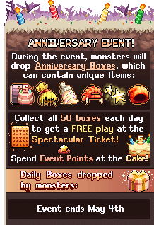 • NEW EVENT! Collect boxes from monsters, open them for new exclusive hats, play the 5th year ticket in town to win new nametags and Event Points, and buy new upgrades at the Event Shop!