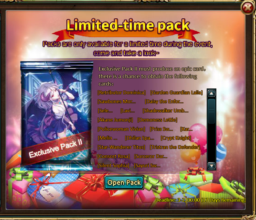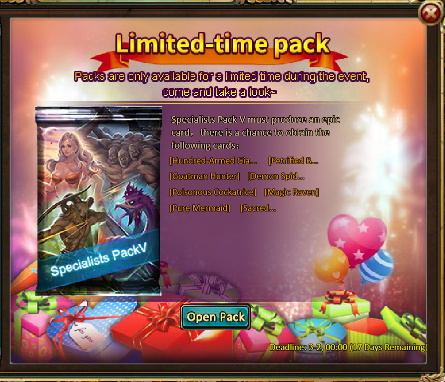 Consume 50,000 gold coins: Black Opal*1, Solar Chest (Legendary)*4, Pet Pleasure*5