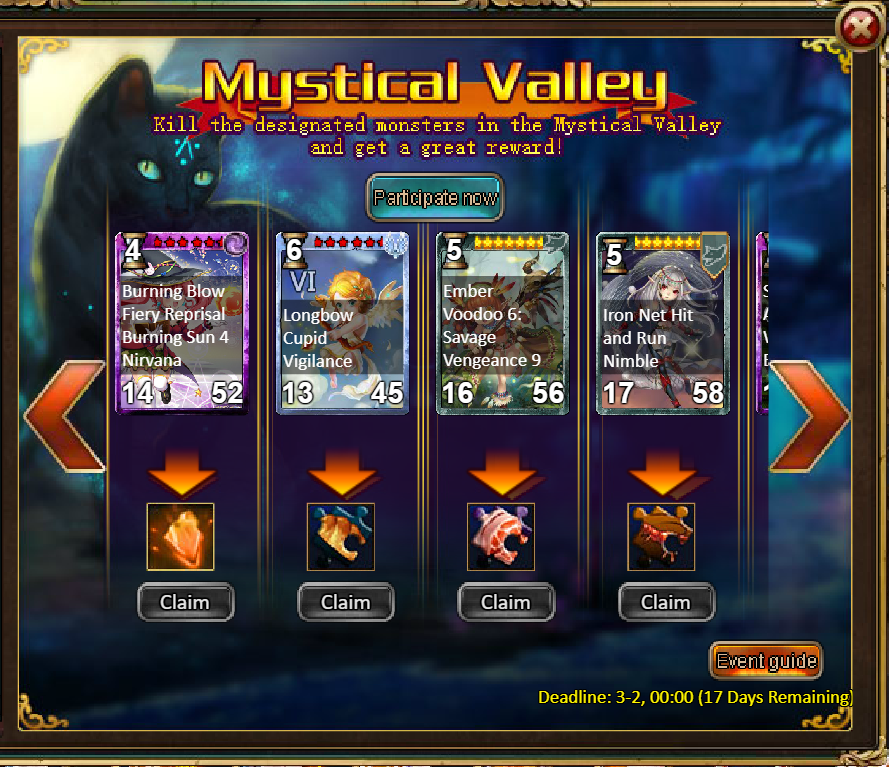 Consume 5,000 gold coins: Mystical Valley Ticket*3, Unbound Skill Tome Shard (Good)*10, Fire Opal*1