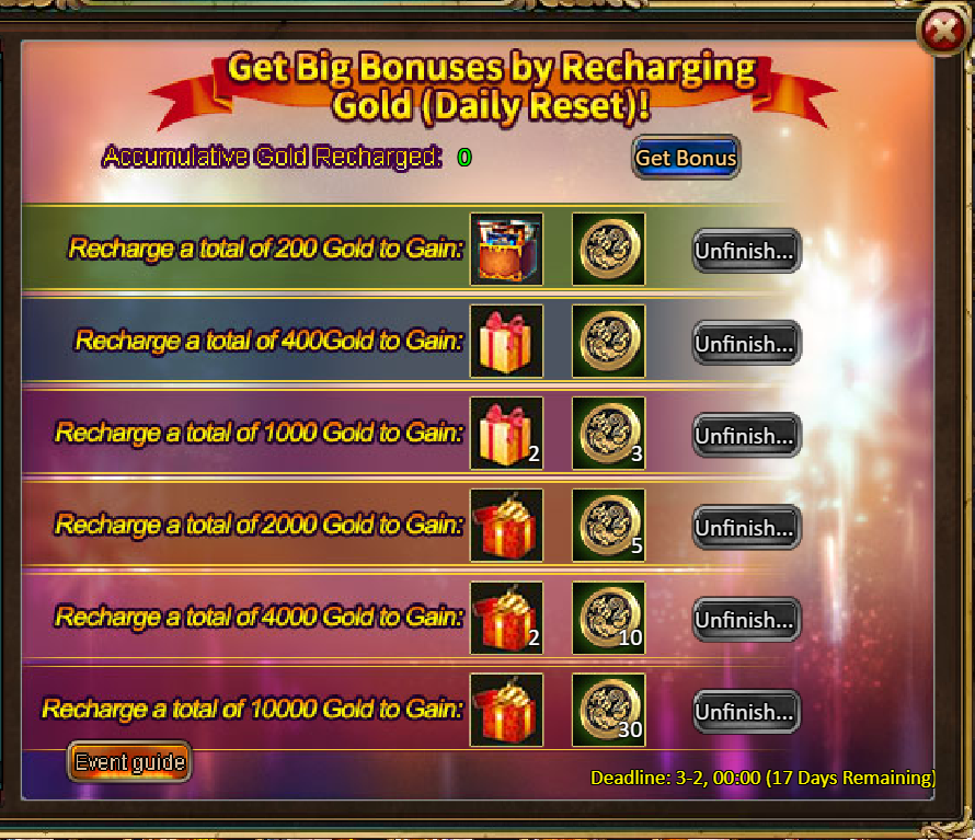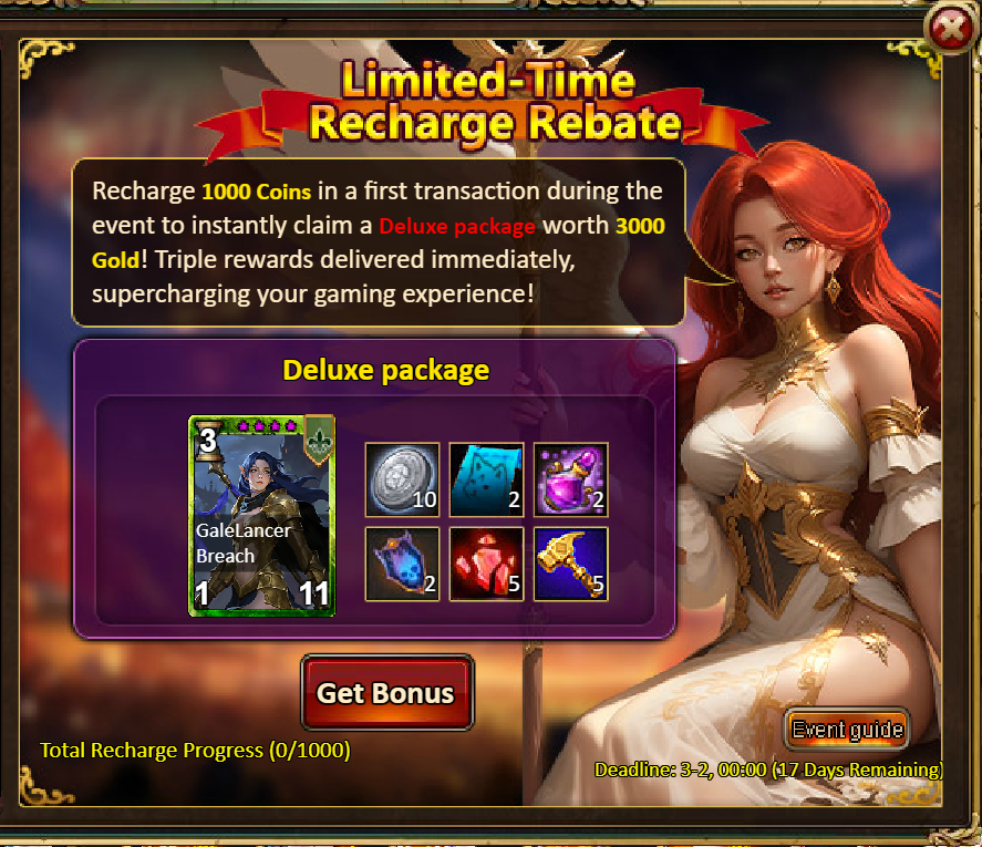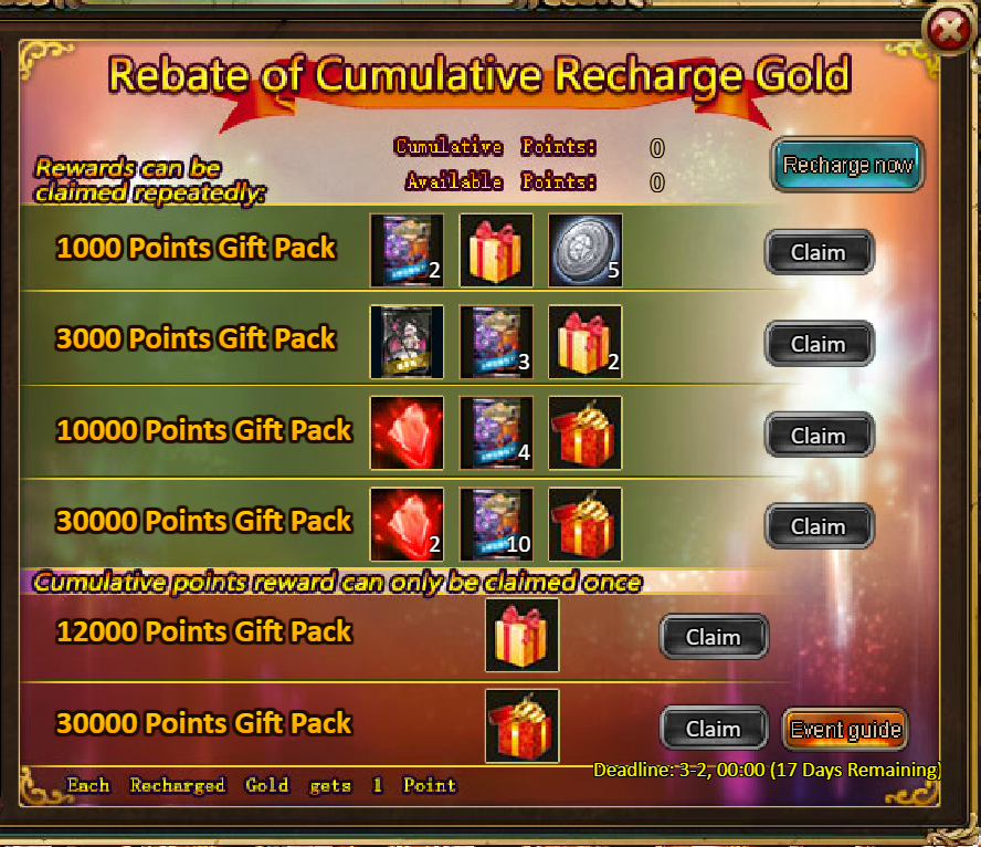 3.Recharge Rebate: Lirael Starspire (Epic)*1 / Silver*100,000 / Mystical Valley Ticket*2 / Dark Champion Potion*2 / Tome Hall Ticket*2 / Ruby Fragment*5 / Gold Tree*1