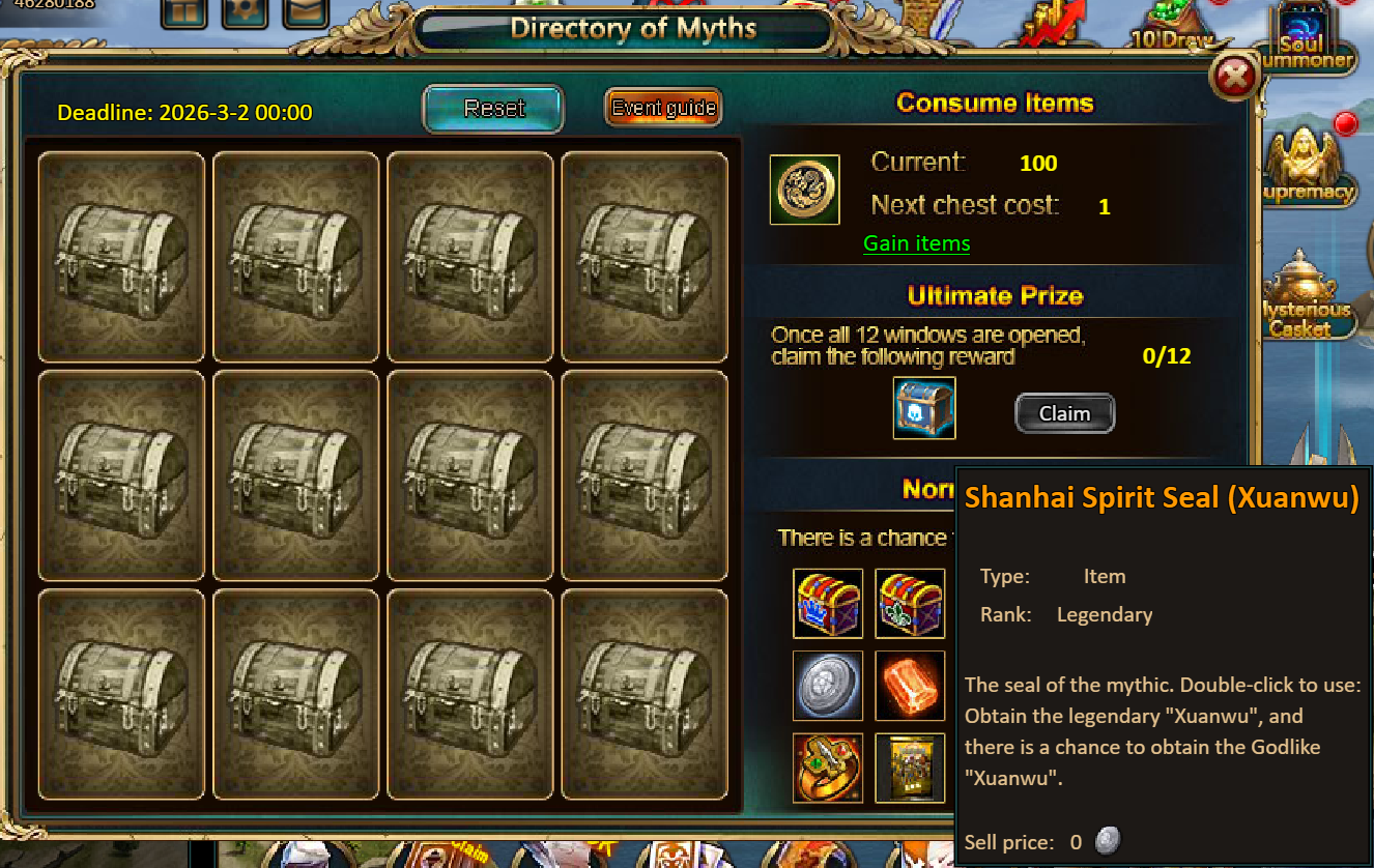 Consume 90,000 gold coins: Black Opal*1, Godlike Box II*6, Solar Chest (Legendary)*6, Silver*5,000,000