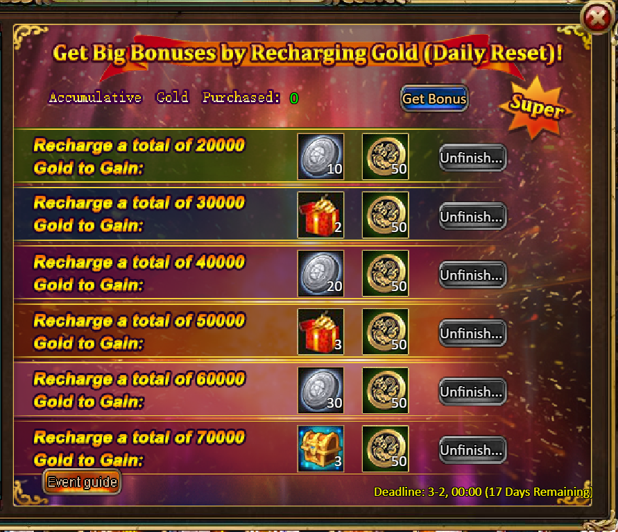 Consume 30,000 gold coins: Fire Ruby*2, Godlike Box II*2, Silver*3,000,000