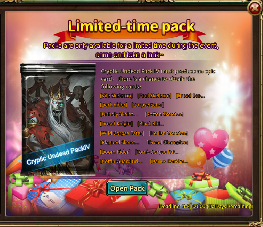 20 packs of Cryptic Undead Pack IV - Opal Fragment*9 / Silver*500,000 / Legendary Box*2