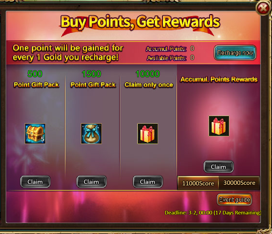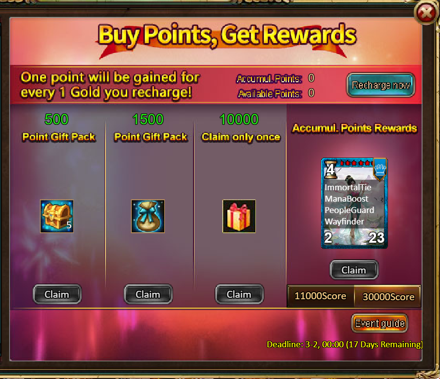 4.Buy Points, Get Rewards: 11000 - Legendary He Xiangu Chest (contains He Xiangu (Legendary)*1, Legendary YearCharge*1) *1 / 30000 - Godlike He Xiangu Chest (contains He Xiangu (Godlike)*1) *1