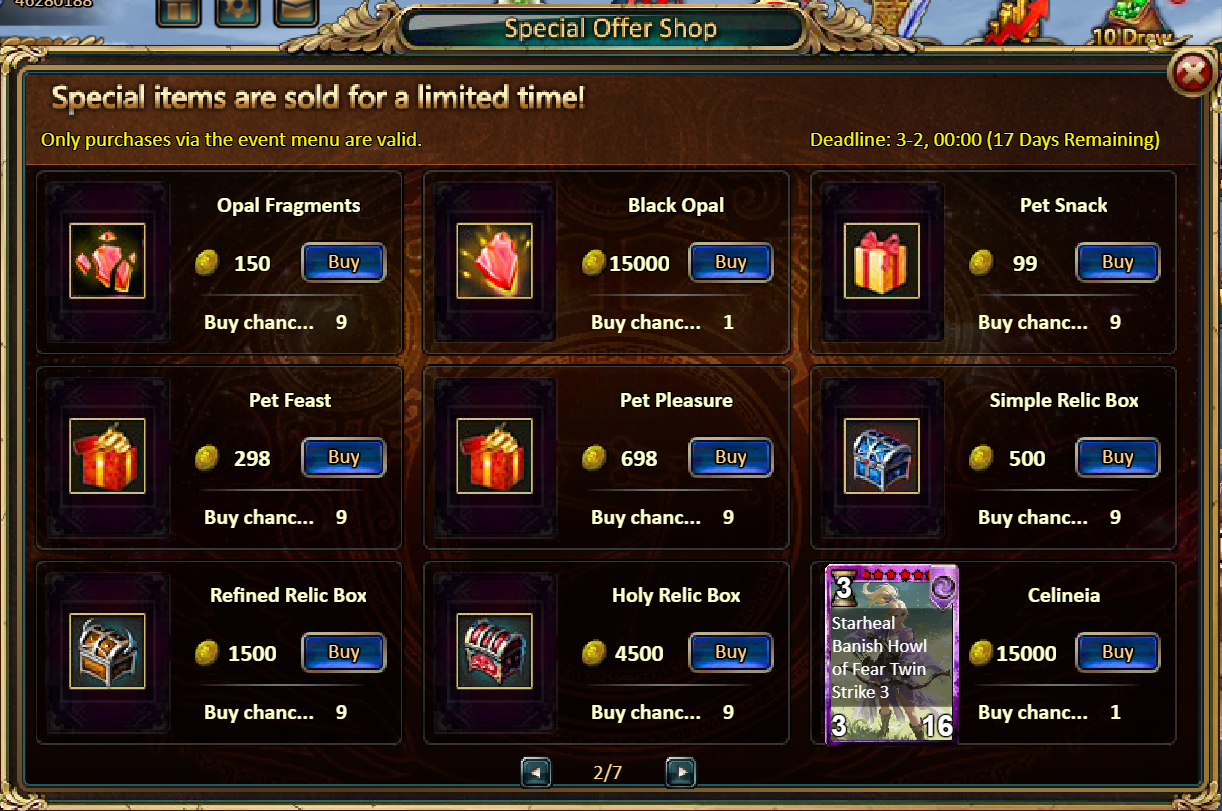 Consume 50,000 gold coins: Black Opal*1, Solar Chest (Legendary)*4, Pet Pleasure*5