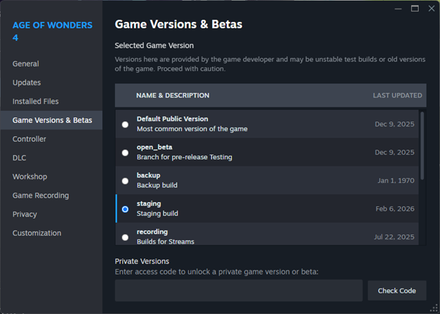 Among the available tabs will be the "Game Versions & Betas" tab.