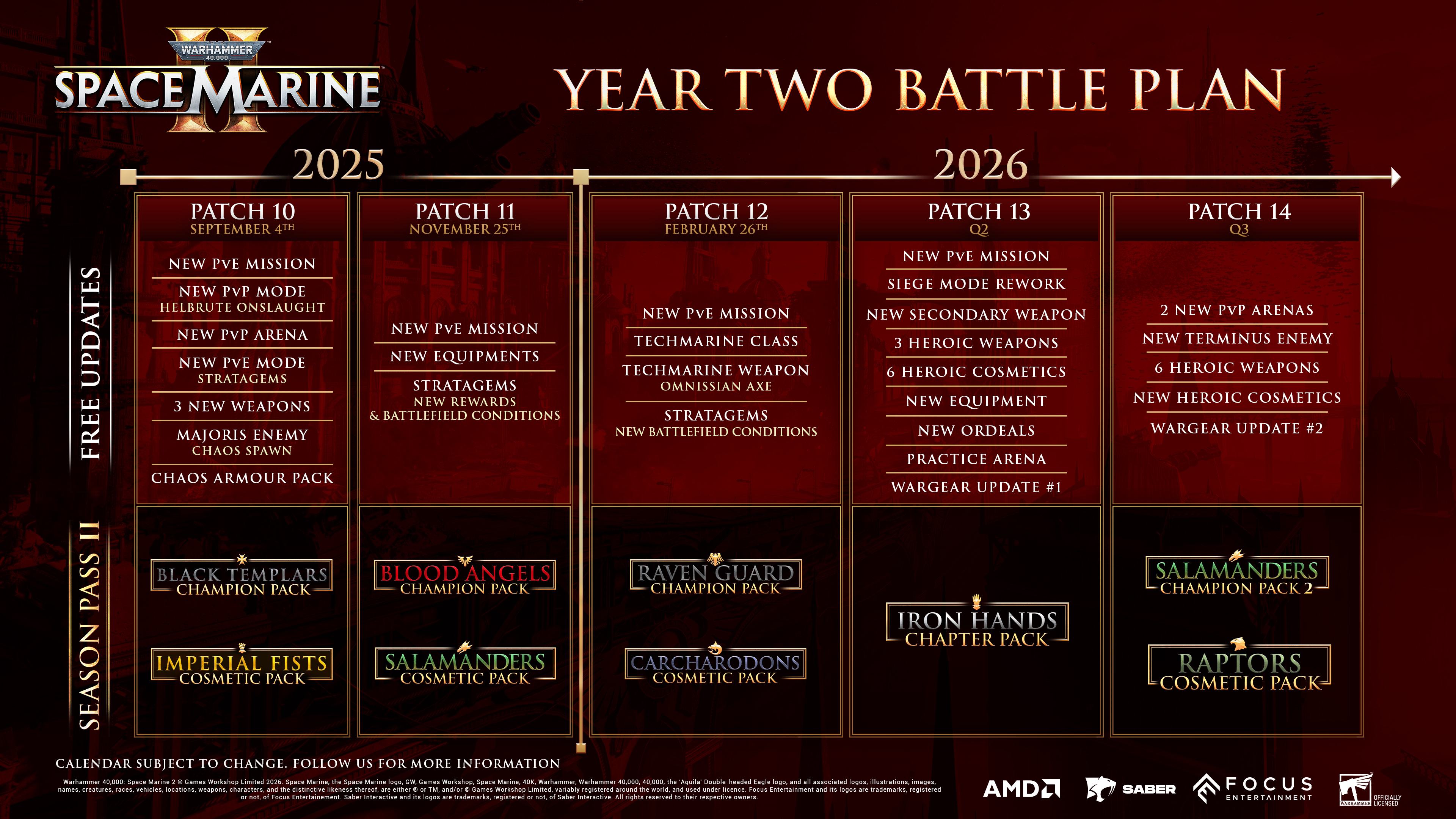 Hello Space Marines,This month has been quite busy for us, which means we’ve got a lot to share with you! In this Community Update we’ll get into more details with the Roadmap, Patch 13’s content, and the current Community Event.TWELVE MILLION PLAYERS ????First of all, we’re incredibly happy to announce that we’ve reached 12 MILLION players!!! ???? ????A couple years ago, we had great hopes for this project. Today, it has surpassed even our wildest dreams. Thank you twelve million times over. ????UPDATED YEAR 2 ROADMAP ????Here is the up-to-date Year 2 Roadmap you’ve been waiting for.Here are a few notable highlights from this new Roadmap: ????The “REDACTED” DLC is going to be the Salamanders Champion Pack 2We are excited to announce Wargear rework that will allow players to use Class specific Wargear on other classes. I.e. capes and Iron Halos on Tactical. You will have to earn the right to do so in game. The update will be split into 2. In Patch 13, we will be adding Capes and Iron Halos, in Patch 14 we will be adding Tabards and Robes. With this you can strike out "something that we've said we are never going to do" from the list of things we've said about customization. ????Siege mode will get a big overhaul and a ton of new features. Like gameplay modifiers that will allow specific build crafting. YOUR DUTY IS NOT YET DONE, BROTHER…Space Marine 2’s live support has officially been extended into a third year, bringing even more free updates and DLC content. ???? Lately, our updates have been very well received by the community, which really motivates us to keep up the momentum for the third year. ????Everything that didn’t make it into the updated Year 2 roadmap will now roll over into Year 3, even though we’re not ready to share more details just yet. Don’t worry, all content that has been postponed will remain free, as it was planned for Year 2.We’re really excited about what’s coming, and we think you will be too!More info coming very soon ????Stay tuned.PATCH 13 ????Let’s dive into the upcoming content together.Please note that this time, there will not be a Public Test Server.Iron Hands Chapter Pack (Season Pass 2)The Iron Hands Chapter pack will include a Techmarine Champion and a skin for its signature weapon, the Omnissian Axe.Additionally, Iron Hands-themed armour pieces will be added as part of the Chapter Customisation Pack: Left & Right Greaves, Left & Right Gauntlets, Left & Right Pauldrons & decals. Symbol customisation will be enabled with this pauldron![carousel][/carousel]New PvE MapThe upcoming new Operation takes place on Kadaku. Your squad will have to investigate Chaos activity near a Cadian base and stop an unholy ritual. We can’t reveal much of it yet, but here’s a glimpse of how it’ll look:[carousel][/carousel]Ultragrind Ordeals and Wargear SharingNew Ordeals, the “Trials of Resolve” will be implemented. These Ordeals are particularly hard to achieve and are meant to test your skills on the long run. Each Ordeal will have up to 3 difficulty tiers. Some of them will require you to complete an Operation a hundred times, or slaying three Majoris or higher enemies with a single headshot on Absolute difficulty for instance. Good luck! ????Starting with Patch 13, you will be able to equip Wargear that was previously only available to other Classes. There are new cloak and Iron Halo items that can be unlocked through these Ultragrind Ordeals. Note that you won’t have to grind for every single wargear, some will be shared right away. However, lore restrictions still apply, for instance: Snipers won’t be able to equip the Iron Halo. So, you will be able to equip additional cloaks and Iron Halos. And with Patch 14, we’ll also add sharing for tabards and robes (like the full Bulwark robe).Siege Mode UpdateSeveral new additions are coming, let’s take a closer look.New items will be added to the Siege shop, now you can earn Accolades for completing Siege mode. New items include a Commissar to boost Cadians, explosive mines, explosive barrels, turrets and a Techpriest to defend as he gets you currency boosts.New modifiers will be introduced including both Blessings and Atonements. It will be up to you to pick and choose them to customise your mission. Pick 1 Blessing amongst 3 every 5 waves. One Atonement is applied every 5 waves as well. You can reroll it against some Siege currency. The Hive Tyrant and the Vortex Beast can now be encountered as Bosses.The timer is getting a rework too. Now, when the timer’s over, you won’t get a Game Over – enemies become subsequently harder to beat. Battle Barge Practice ArenaThe Practice Arena is a new addition to the Battle Barge. Only available in solo, this new area allows you to test your weapons on the enemies of your choice, in the difficulty of your choice. You will have a display showing the total damage dealt and your damage per second. Ideal to try out new weapons, check the most efficient combos and so on.Check our 6min gameplay video for
