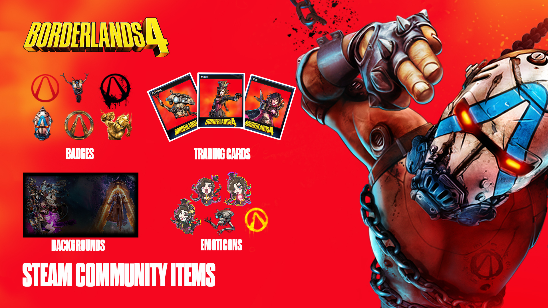 Bring the mayhem of Kairos to your Steam profile with Borderlands 4's Steam Community Items and Point Shop Items, available now!In case you're unfamiliar, Community Items are items you can unlock by playing Borderlands 4 on Steam or trading with your friends. Points Shop items are Steam personalizations you can get by redeeming Steam Points; check out the Steam Points overview for full details.Community ItemsUnlock these rewards as you play Borderlands 4 on Steam.Steam Trading CardsCollect Steam Trading Cards for Borderlands 4 characters Vex, Rafa, Amon, Harlowe, ECHO-4, Claptrap, Moxxi, Zane, Amara, and The Timekeeper, then trade with your friends to complete the full set!BadgesAdd these new Steam badges—showcasing various Vault Symbols, Claptrap, and intimidating Rippers—to your collection!Profile BackgroundsShow the world your Vault-hunting prowess with these Profile Backgrounds featuring eye-catching Borderlands 4 artwork!EmoticonsGive your friends some sugar with these Borderlands 4 Emoticons:Moxxi HappyMoxxi HeartMoxxi WinkECHO-4Vault SymbolHead to the Steam Points Shop to check out the above items and customize your profile:https://store.steampowered.com/points/shop/app/1285190