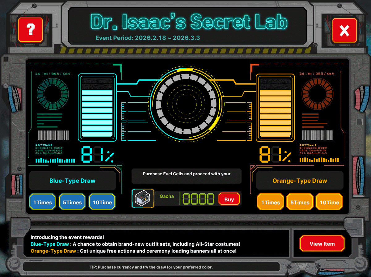Get ready to supercharge your journey in Dr. Isaac’s Secret Lab! Fuel Cells are now up for grabs, and this is your chance to power up yourprogress like never before!With a special limited-time discount available, you can stock up, chooseyour draw type, and uncover high-tech upgrades waiting just beneath thesurface! 2026/02/18 00:00 ~ 03/03 23:59 (PST) Purchase Fuel Cells→ Fuel Cells are now available for purchase using Event GKash currency.→ Special Offer: 20% Discount Purchase 100 Fuel Cells and enjoy up to a 20% discount on your draws!Choose your preferred color and dive into the draws! [ALL-STAR] SPIRAL JOE OUTFIT (M/F)UNDERLINE OUTFIT (M/F)DATASTREAM OUTFIT (M/F)SIMPLE BASEBALL OUTFIT (M/F)Free action: No Cure (M/F) Note:→ All rewards from the event will be sent directly to your Gift Box.→ Unused currency will be deleted once the event ends, so make sure to spend itbefore the clock runs out You may check the in-game event's Help section for more details.You may check the in-game event's Help section for more details. =================================================Don't miss out on this limited-time event! Explore, collect, and createyour own unique look in Freestyle 2.Thank you for your continued support.Be free to create your own style, Freestyle!~ FreeStyle 2 Team