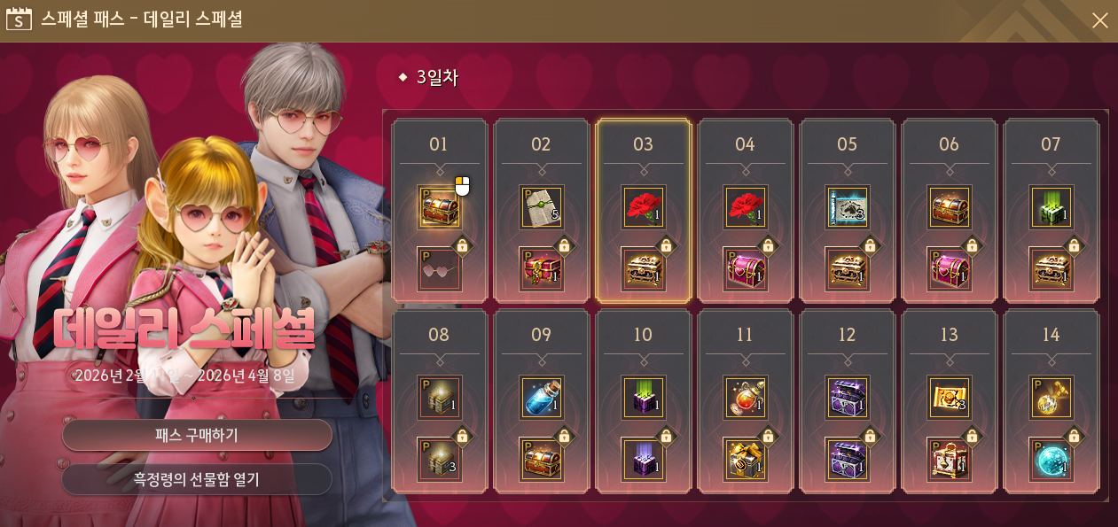 Check out this week's new events!Special Boxes Have Appeared Feb 12, 2026 (Thu) after maintenance - Feb 26, 2026 (Thu) before maintenance Red Horse's Aura Arrives in Monster ZonesSpecial gift boxes are appearing in monster zones.▲ If you find a gift box, defeat it right away.Defeat the box to receive the Red Horse's buffand [Event] Red Horse Pouch of Fortune????[Event] Red Horse's Aura and [Event] Red Horse Pouch of Fortuneare not affected by Item Drop Rate effects. [Event] Red Horse's Aura* Applied instantly upon acquisition.[Effects]- Extra AP Against Monsters +5- Monster Damage Reduction +5- Death Penalty Resistance +5%[Duration] : 5 min [Event] Red Horse Pouch of FortuneOpen the [Event] Red Horse Pouch of Fortune to get various items. Open to obtain all of the following. Mystical Spirit Powder x15-25 Cron Stone x3 Sealed Black Magic Crystal x5 Open to obtain all of the following. [Event]Rare Red Horse Pouch of Fortune Bundle of 2,000 Cron Stones Advice of Valks (+100) [Event]Enhancement Help Kit V [Event]Life Enhancement Help Kit III [Event]Rare Courser Training Box Fruit of Yianaros Mysterious Blue Conch Brilliant Crimson Fire Flower Sharp Black Crystal Shard x1-2 Traveler's Map Learn More!A Bountiful New Year: Red Seabream Arrives Feb 12, 2026 (Thu) after maintenance - Feb 26, 2026 (Thu) before maintenanceReel in three kinds of Red Seabreamacross all fishing locations during the event.????The 3 [Event] Red Seabream types will not affect the drop rates of existing fish, and they can still be caught even when "Discard lower grade fish caught during fishing" is enabled.????Effects that let you catch multiple fish at once, like the Triple-Float Fishing Rod, do not apply to 3 [Event] Red Seabream types. However, it’s still possible to catch all three types at the same time. Three Types of Red Seabream [Event] Red Seabream [Event] Sunset Red Seabream [Event] Dusk Red Seabream A Red Seabream prized for its firm texture and clean, savory finish. Its flavor wins praise from all who taste it, and merchants from every region buy them up for a high price.Selling Price: 10,000,000 Silver Renowned for its elegant aroma and rich, savory depth, discerning merchants are eager to buy this fish at a premium price.Selling Price: 30,000,000 Silver Clean on the tongue, with a gentle sweetness beneath... its quality is beyond dispute, and merchants across the lands buy up every last one for a handsome price.Selling Price: 50,000,000 SilverHelp "Donghwa" prepare for the holidayand get a special gift.✅Accept the event quest from "Donghwa," then give her [Event] Red Seabream to complete it. NPC Location Complete the Family and weekly queststo claim extra rewards.* You can accept and finish [Event] [Weekly] Donghwa's Request until Feb 25, 2026 (Wed) 23:59 (UTC), after you complete [Event] Donghwa's Holiday Prep. Event Quests Quest Objective Rewards [Event] Donghwa's Holiday Prep* Once per Family Hand over [Event] Red Seabream x5 [Event]Bountiful New Year's Box[Event] Red Horse Lantern x10 [Event] [Weekly] Donghwa's Request* Once per week Hand over [Event] Red Seabream x1 [Event] Leap of Growth x3[Event] Wise Housekeeper x3* Find these quests in Quests (O) - New.Learn More!Happy Holidays, 1,000% Hot Time! Feb 12, 2026 (Thu) after maintenance - Feb 26, 2026 (Thu) before maintenance Celebrate the holidays with Black Desert’s Hot Time! [color=#ff0000]1000%[/color]Combat EXP 400%Skill EXP 100%Life EXP(excluding Trading & Training) [color=#ff0000]100%[/color]Item Drop RateLunar New Year Special Login Rewards Feb 13, 2026 (Fri) 00:00 (UTC) - Feb 25, 2026 (Wed) 23:59 (UTC) Daily Rewards A Special Box from the BlacksmithLog in daily for 7 days to collect special rewards! Daily Rewards Day 1 [Event] Lucky New Year Gift Box Day 2 Blacksmith's Shiny Box Day 3 [Event] Enhancement Help Kit V Day 4 Blacksmith's Shiny Box x2 Day 5 [Event] Life Enhancement Help Kit III Day 6 Blacksmith's Shiny Box x3 Day 7 Cron Stone x2,000Learn More!Daily Special Rewards & Special Pass????Daily Special Sale Period Feb 12, 2026 (Thu) after maintenance - Mar 26, 2026 (Thu) before maintenance????Daily Special Reward Period Feb 12, 2026 (Thu) after maintenance - Apr 9, 2026 (Thu) before maintenanceWhat's the Daily Special?Press the icon to the top left of the minimap!Get the New Accessory: Heart-Shaped Sunglasses!Check out the rewards available in this Daily Special.Purchase the Daily Special Pass from the Pearl Shop to unlock extra rewards. Daily Special Pass With the Daily Special PassUpgrade Your Rewards!Daily Special Pass3500 Pearls????Heart-Shaped Sunglasses Preview????Learn More!All Ongoing Events
