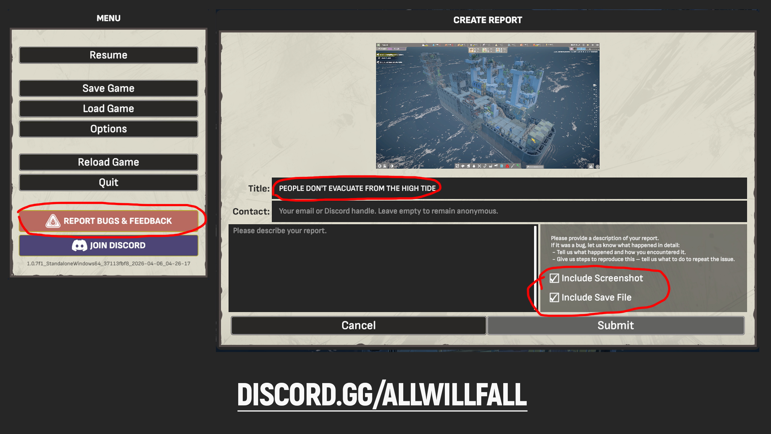 Hello, survivors! Thank you for reporting bugs and helping us fix them, we appreciate that a lot!We wanted to post this short guideline on how to submit a bug if you're new to this. Please follow along: Try reporting a bug through the in-game tool first - this way it attaches your save file and screenshot and then sends it directly to us. Always add the basic description (at least a title explaining what's wrong) If the game crashed, relaunch it and you'll see the auto report to send. If the auto report does not work, send the normal bug report from the Main Menu (red bug-shaped icon) - it will attach your latest save file. Submitting bugs on Discord is also welcome, do this here. Please do not crop your screenshots - add everything! You see any translation error? - Submit it here. We're already fixing errors that you've reported, and we'll be doing it until we fix everything. Thank you to everyone who helps us catch those bugs so far!PLAY NOWhttps://store.steampowered.com/app/2706020/ALL_WILL_FALL_PhysicsBased_Survival_City_Builder/Thanks for reading Survivor! Follow ALL WILL FALL: Physics-Based Survival City Builder to stay updated.Have any feedback for us? Visit our discussion page here or join our Discord server to let us know.Keep building, just don't crumble!SOCIAL: DISCORD | TWITTER | INSTAGRAM | REDDIT | FACEBOOK | YOUTUBE | TIKTOK | BLUESKY