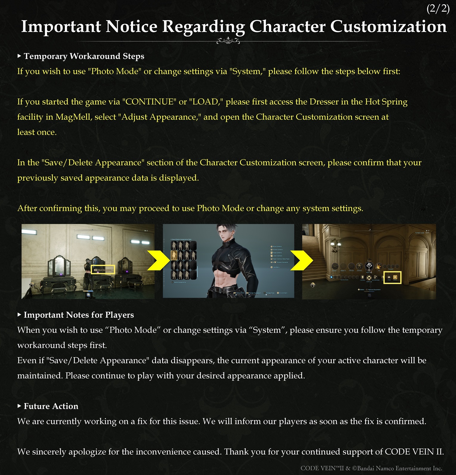 Dear CODE VEIN II Players,Please see below for an update on the issue currently affecting character customization.This issue is occurring in both the full version of CODE VEIN II and the CODE VEIN II Character Creator Demo. Please check the attached image for more details.We are currently working on a fix for this issue and will provide another update once the release schedule for the fix is confirmed.We deeply apologize for the inconvenience this has caused.