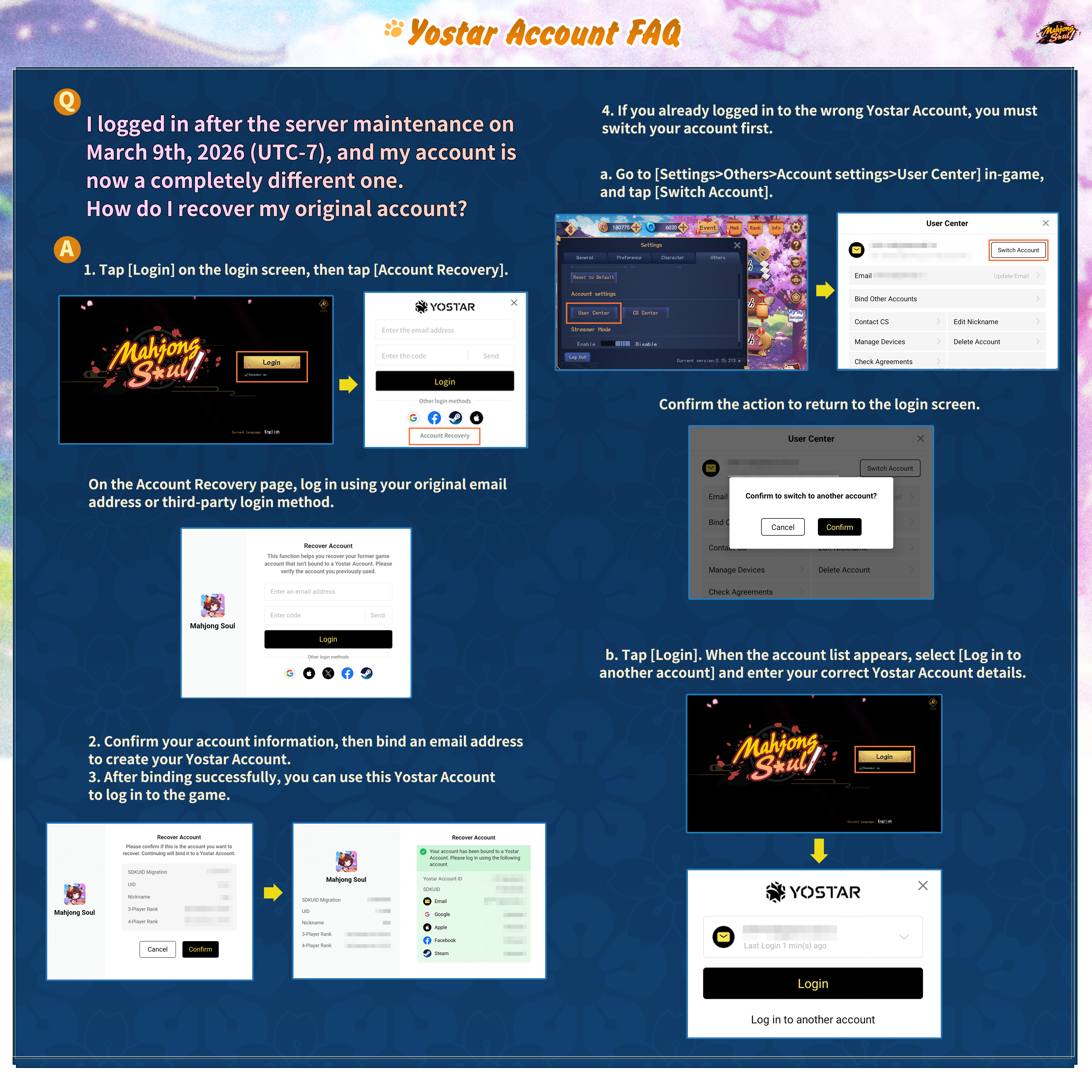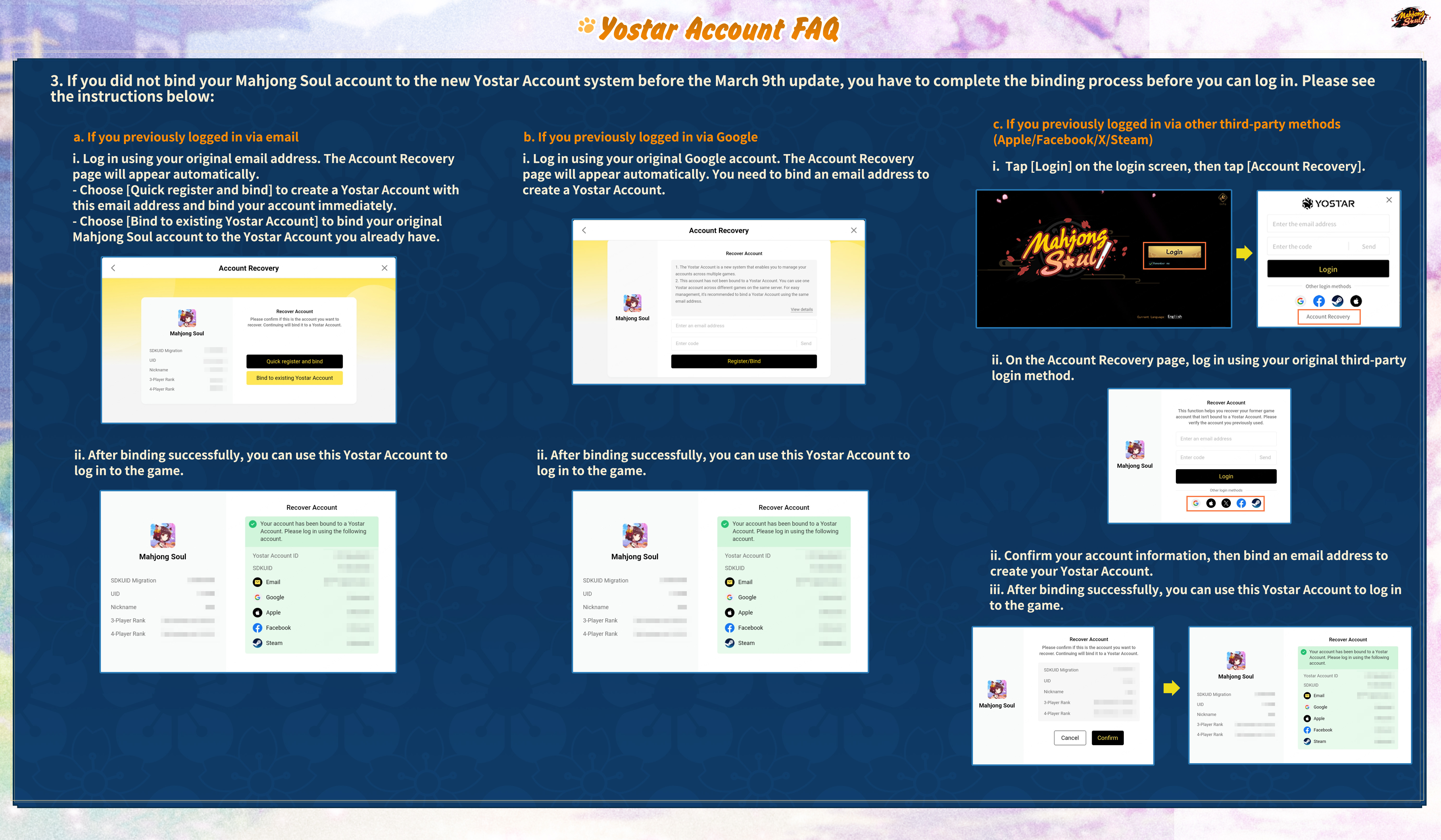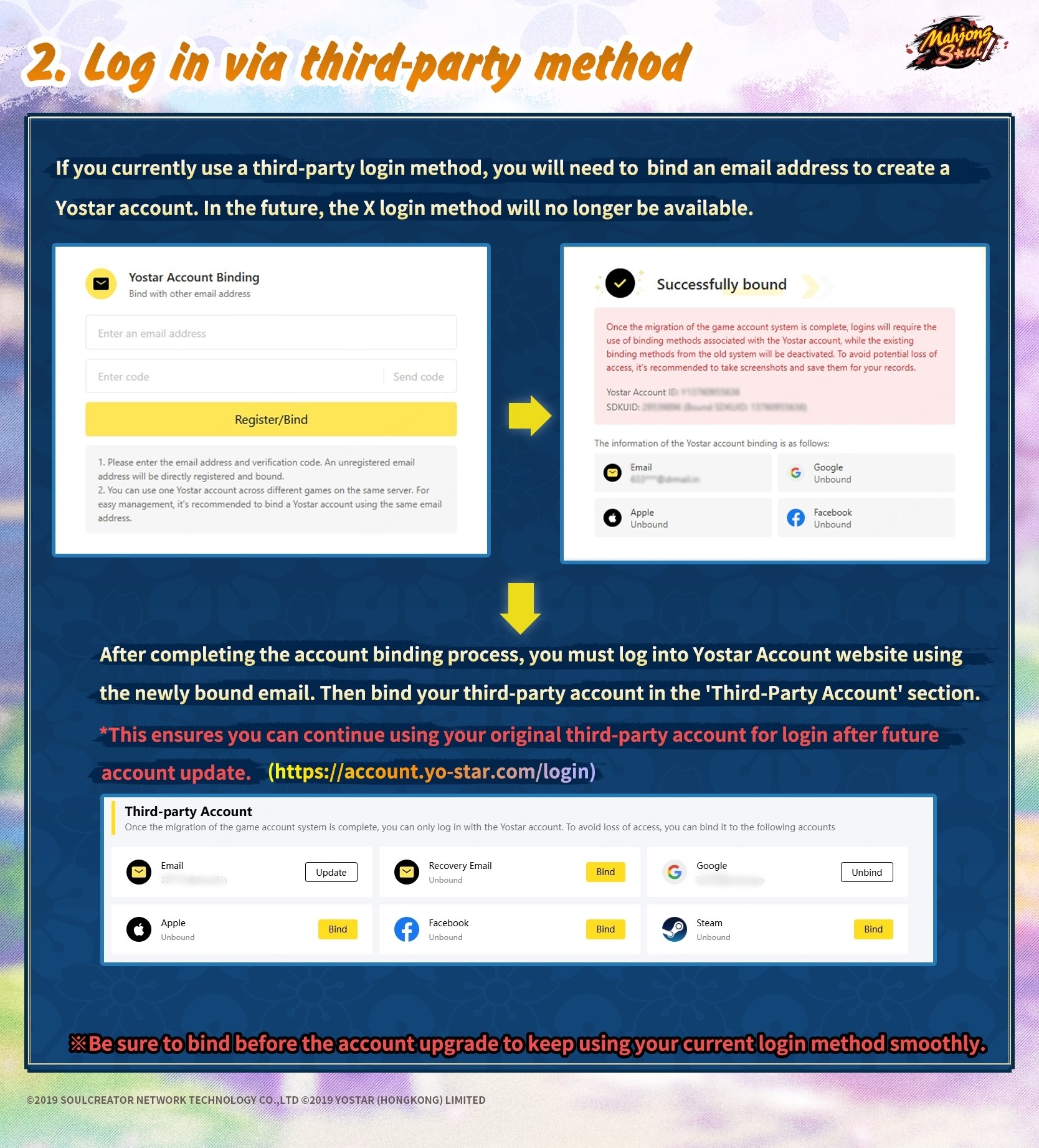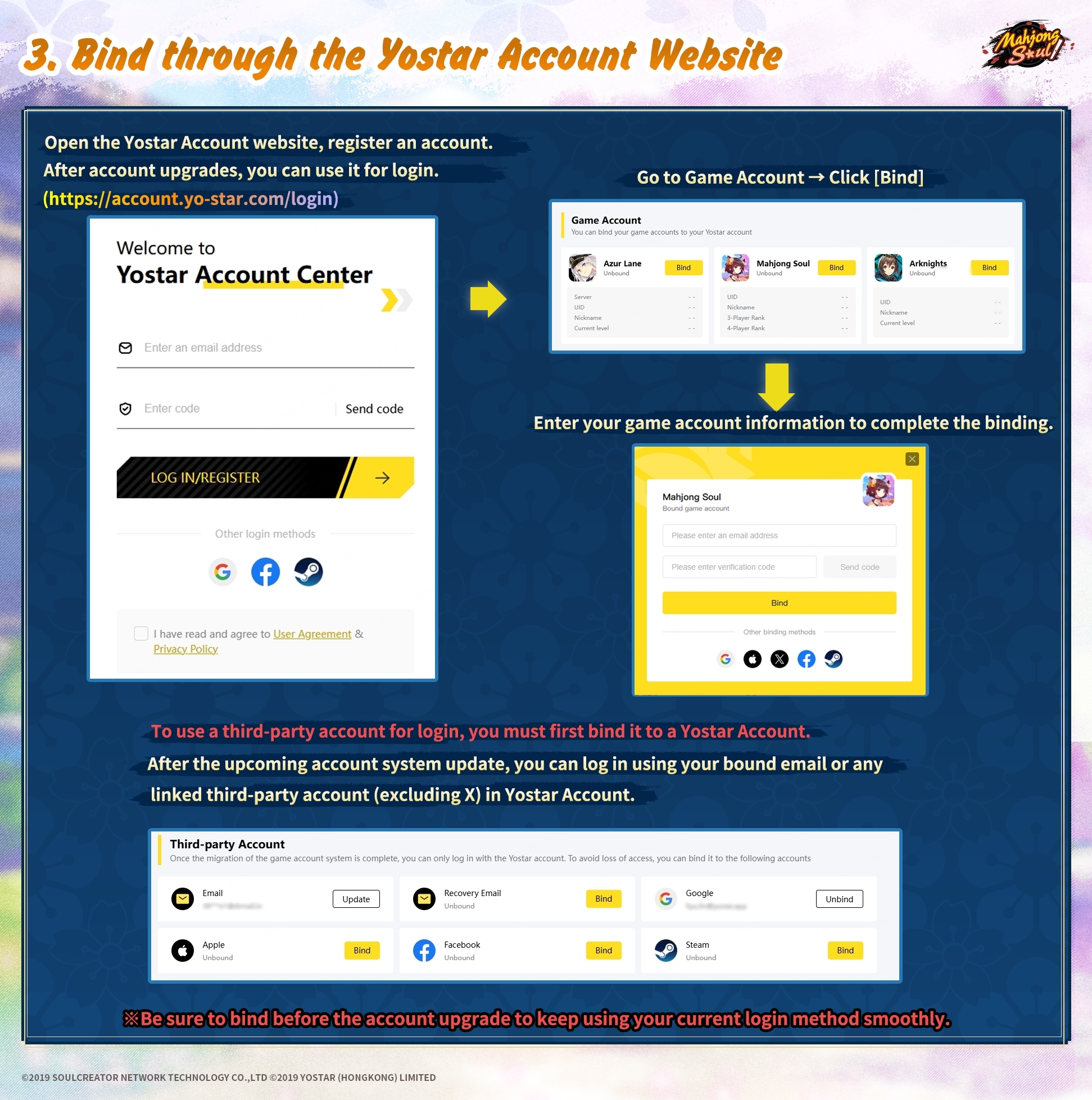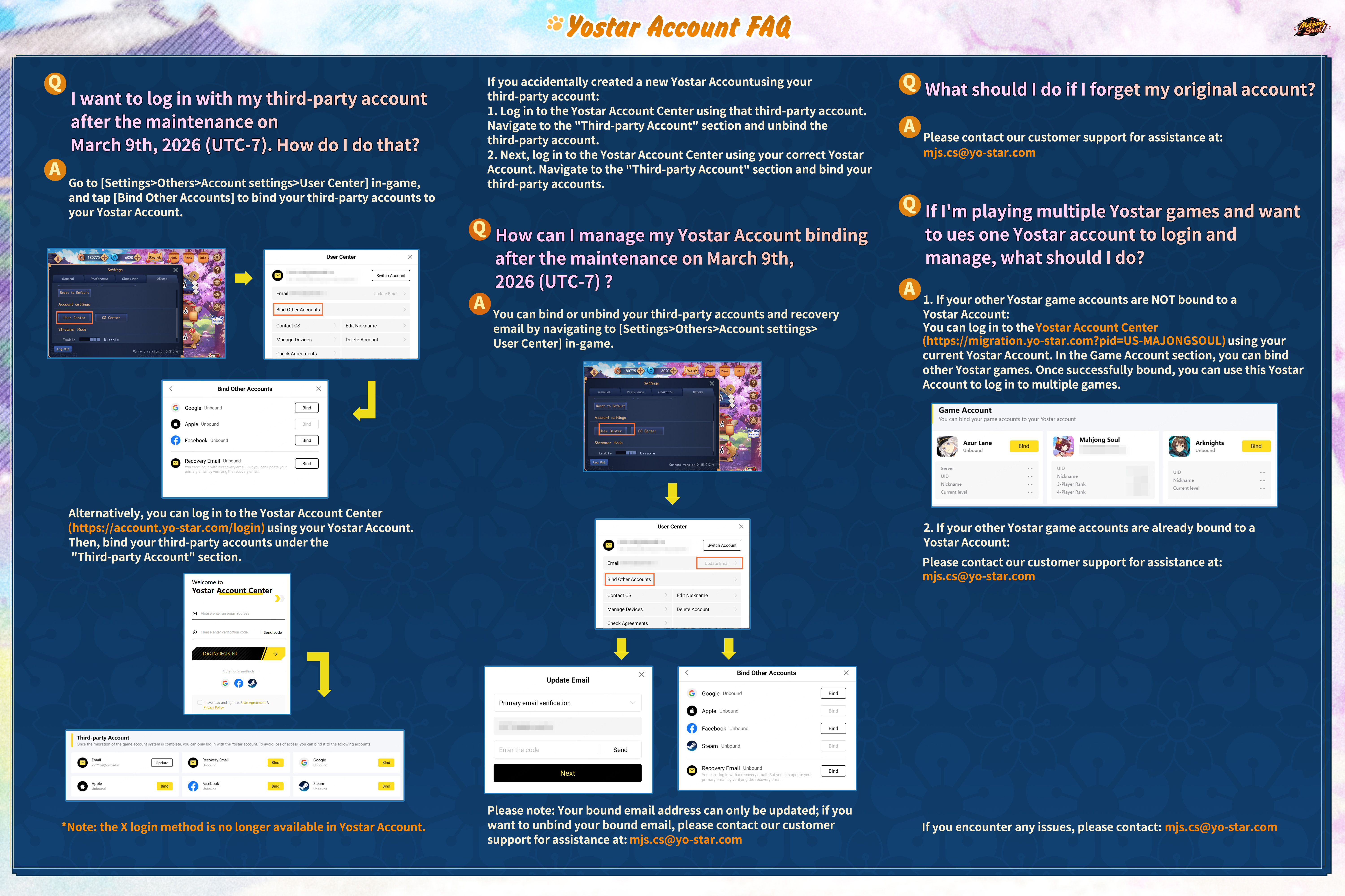 Binding InstructionsThe Yostar Account system will be available after the server maintenance on March 9th, 2026 (UTC-7). Following this update, only the new Yostar Account system will be supported for login. To ensure uninterrupted access, we strongly recommend completing the binding process before the official launch of the new login system.Please follow the instructions carefully in the images below to complete the binding.*For users logging in via a third-party method, it is necessary to bind your third-party account to a Yostar Account on the Yostar Account website. This will ensure you can continue using your original third-party login after the Yostar Account update. (Please refer to Image 3 for detailed steps.)