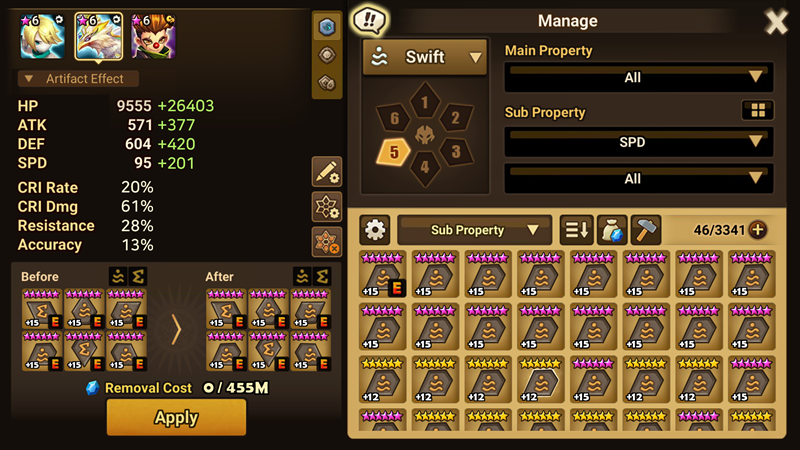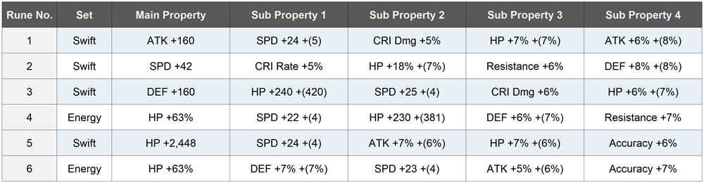 Press the \[Runes/Artifacts] button to move to the screen where you can configure the Runes and Artifacts for each Monster.