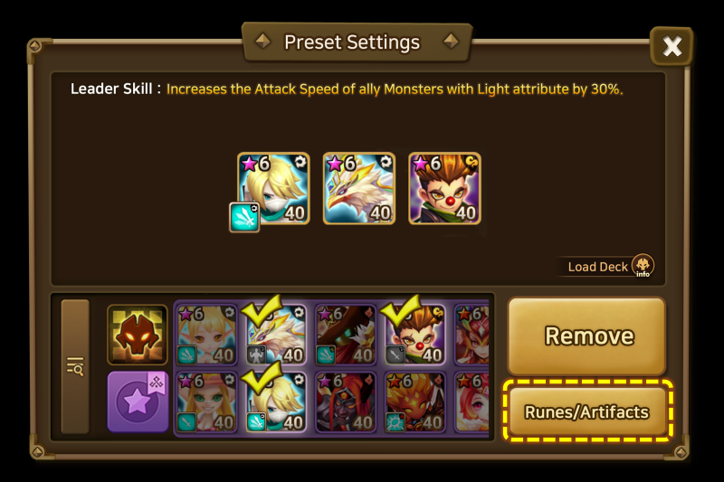 Once you have placed all the Monsters you want for your attack deck, you must set the Runes and Artifacts they will use.