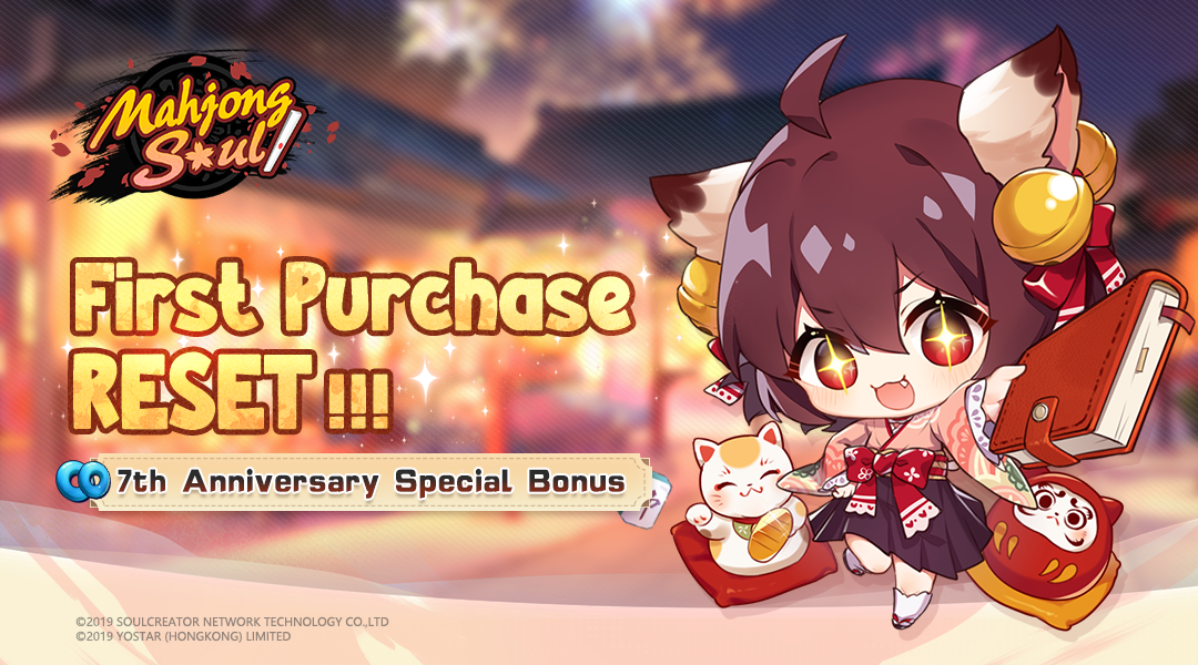 To celebrate the 7th Anniversary of Mahjong Soul EN, the First Purchase Bonus of all tiers of the Jade purchase will get reset (Fortune Charm not included).