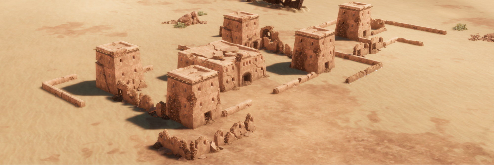 To make the planets more unique, we started to add assets that only show up in the environments on one planet. Starting with Mock, we added ruins of ancient desert civilizations that once inhabited the barren deserts.