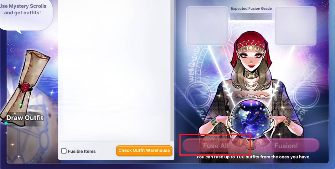 → 'Fuse ALL' allows you to fuse up to 100 outfit items that meet the