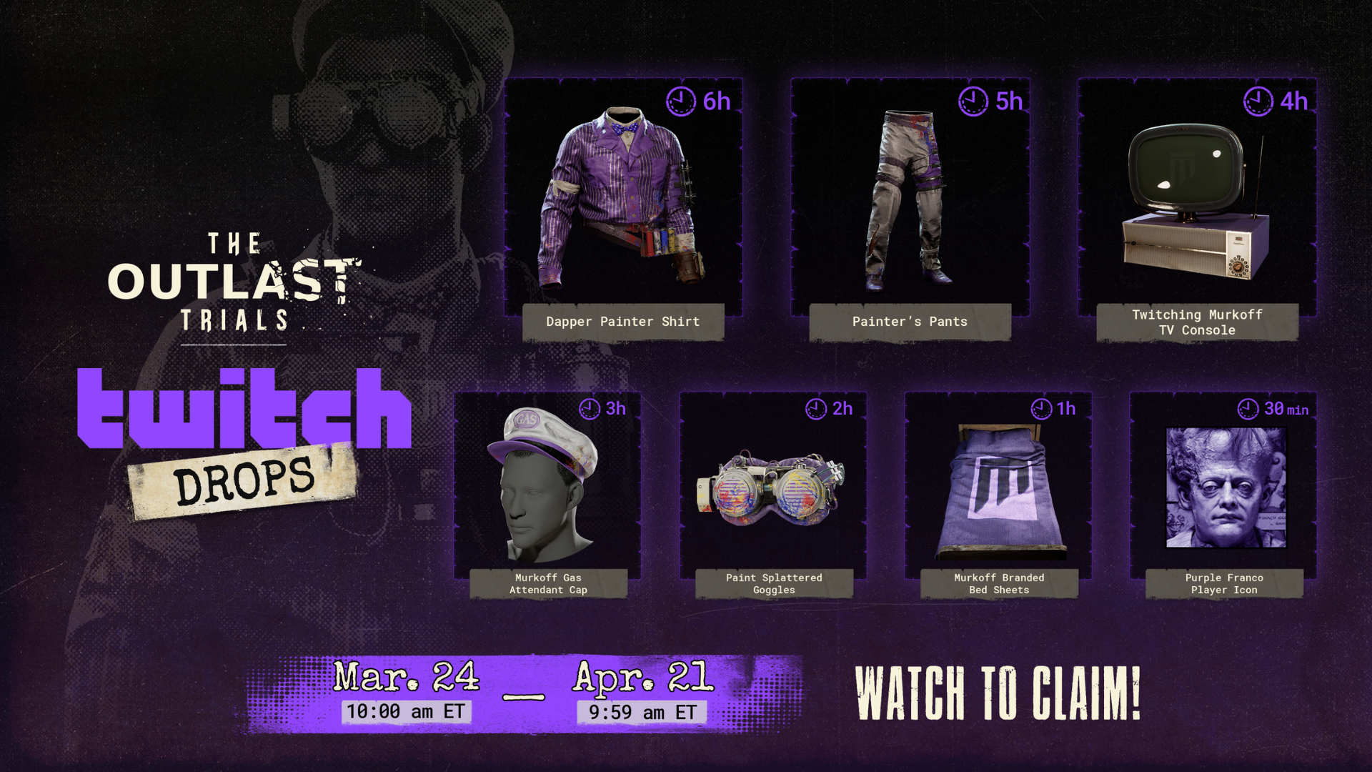 Check out our FAQ to learn more about how to link your game to Twitch and how you will be able to earn exclusive rewards by watching any content creators play The Outlast Trials on Twitch!