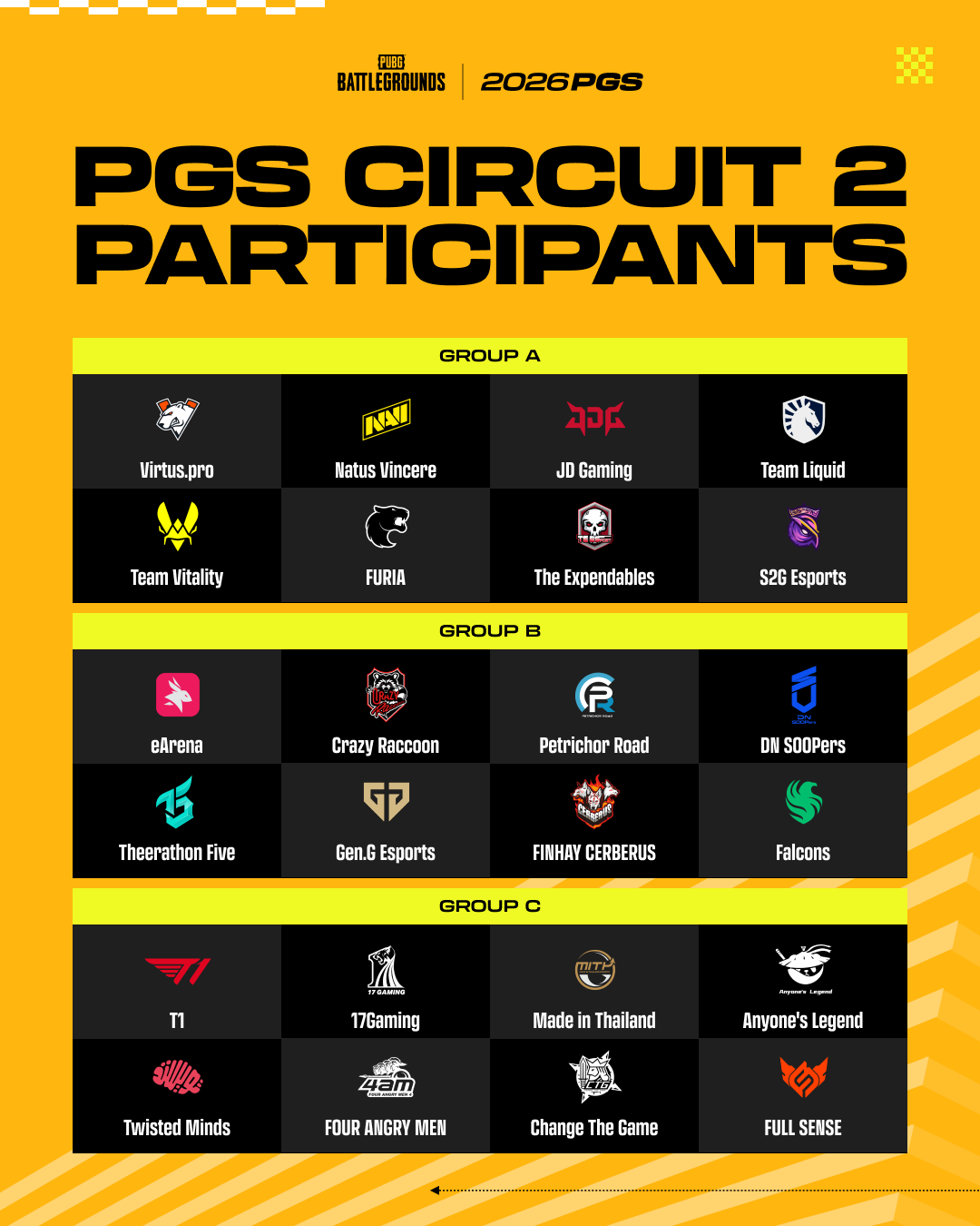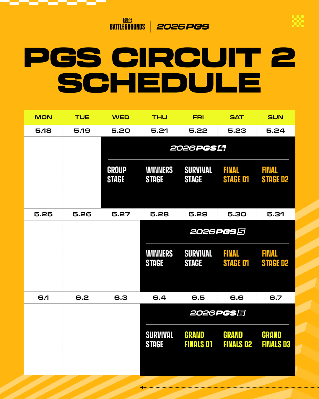 A little over a month after Circuit 1's unpredictable three weeks, the 24 teams are back in Seoul. The PUBG Global Series returns with its second circuit — PGS 4-6 — kicking off May 20.Circuit 2 isn't a reset. The PGS Points earned in Circuit 1 carry directly into the standings, and the final results here decide who qualifies for the Esports World Cup (EWC). Add a new patch to the mix, and the question becomes: how do the strategies teams locked in during Circuit 1 hold up in a different environment? Circuit 2 Overview Location: Seongsu, Seoul, South KoreaParticipating Teams: 24 TeamsTotal Prize Pool: $500,000 (PGS 4-5: $100,000 each / PGS 6: $300,000)All Circuit 2 matches begin at 19:00 KST (10:00 UTC / 11:00 CET / 17:00 ICT / 03:00 PDT) daily. *PGS 4 Day 1 Group Stage begins at 14:00 KST (05:00 UTC / 06:00 CET / 12:00 ICT / 22:00 PDT†). † Previous day (May 19) Group Stage Seeding — Based on PGS 3 ResultsCircuit 2 Group Stage seeding was drawn via snake draft from PGS 3 final standings. Circuit 1 results shape the starting line of Circuit 2 directly. Looking Back at Circuit 1 — The Starting Point of Circuit 2These are the top 12 teams in PGS Points from Circuit 1 — the teams closest to the EWC qualification line heading into Circuit 2. Their performance over the next three weeks will decide who makes the cut: the top 8 teams in cumulative first-half PGS Points earn EWC spots. What's Changed from Circuit 1 — Game UpdatesThe biggest variable in Circuit 2 is the game patch. PGS 4 and PGS 5 run on the April Update (Patch 41.1), which brings several updates that could directly affect team strategy. How Circuit 1's refined approaches hold up in this new environment is the circuit's biggest storyline. Terrain Destruction Reshapes the BattlefieldThe headline change is a major expansion of terrain destruction.Erangel now joins Rondo, Taego, Sanhok, and Miramar — meaning terrain itself becomes a tactical layer across all major competitive maps. Pickaxe strikes also dig deeper than before, giving teams new options for cover and route design.Terrain is no longer a fixed environment, but something players can shape. How new combat patterns emerge through grenades, mortars, Panzerfausts, C4, pickaxes, and vehicle explosions will be a key watchpoint throughout Circuit 2. Gunplay — New Options and Rebalanced WeaponsThe most notable gunplay change in this patch is the new Hybrid Scope.The Hybrid Scope switches between 1x and 4x magnification instantly, covering both close- and mid-range fights with a single attachment. It fills the void left by the Canted Sight's removal and should reshape how pros approach attachment choices and engagement distance.The patch also includes additional new attachments and weapon balancing. Grip-tier changes and recoil adjustments to key weapons are in, so expect teams to revisit their gun setups and combat approach. Gameplay — New Variables for Supply and SurvivalThis patch introduces a new support item (the Emergency Support Flare), expanded Trigger Backpack tiers, and new BlueChip Tower functionality.The BlueChip Tower changes stand out. Destroying enemy BlueChips to block revives used to be the whole play — now, teams can spend 2 enemy BlueChips at a BlueChip Tower to call in an air supply drop. Enemy BlueChips become a resource instead of just something to remove, and Circuit 2 should showcase far more strategic usage around them.Circuit 2's final series, PGS 6, runs on a version that incorporates the May Update. Details will follow in the May Patch Notes. Map Order — Adjustments from Circuit 1The map pool stays the same as Circuit 1 — Erangel, Miramar, Taego, and Rondo — but the order per stage has changed.StageMatch 1Match 2Match 3Match 4Match 5Group Stage (PGS 4)ErangelMiramarTaego——Winners / Survival / Final D1 / Grand Finals D1·D3ErangelMiramarTaegoRondoErangelFinal D2 / Grand Finals D2TaegoErangelRondoMiramarTaego*Group Stage runs the same Erangel → Miramar → Taego cycle across all three matchup rounds (A&B, B&C, A&C) for Matches 1 through 9. Key changes from Circuit 1:Taego comes in earlier. With Taego in the rotation from the opening matches, team map preferences and prep priorities will shift.Final Stage and Grand Finals Day 2 have been fully restructured. Different late-game decisive maps mean match flow is harder to read than it was in Circuit 1. Why Circuit 2 Matters — The Final Battle for EWC QualificationCircuit 2's results go beyond the PGS race — they directly determine Esports World Cup (EWC) 2026 qualification.EWC Qualification — The top 9 teams in cumulative PGS Points from PGS 1-6 earn EWC spots. (2025 EWC champions Twisted Minds hold a separate seed.)Circuit 2 is the final stage of the first half — Circuits 3 and 4 run in the second half (August onward), which means EWC qualification locks in the moment Circuit 2 ends.The annual PGS Points race continues — Circuit 2 results are also a key foundation for direct qualification to PGC 2026 (top 8 teams).For teams holding
