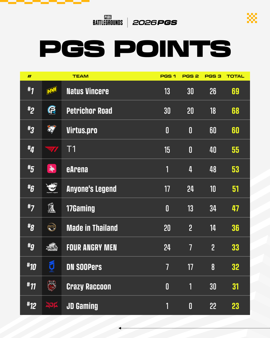 These are the top 12 teams in PGS Points from Circuit 1 — the teams closest to the EWC qualification line heading into Circuit 2. Their performance over the next three weeks will decide who makes the cut: the top 8 teams in cumulative first-half PGS Points earn EWC spots.