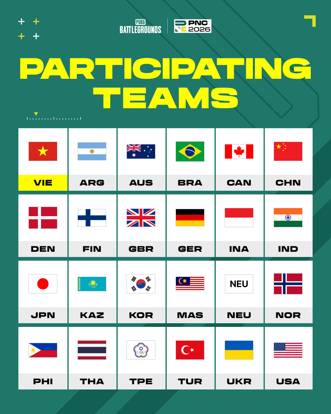 Hello, PUBG Esports Fans!The PUBG Nations Cup 2026 (PNC 2026) is returning to Seoul, South Korea, this summer!24 teams will once again battle across five days of intense competition. With new challenger teams joining the fray, this year's PNC will feature the most diverse lineup in the tournament's history. Get ready for the ultimate all-star showdown in PUBG Esports — PUBG Nations Cup 2026!When and Where?PNC 2026 will take place from June 23 to June 28, with the Grand Finals held at Jangchung Arena in Seoul — returning to the venue for the first time in seven years since 2019!Survival Stage: June 23 – 24Grand Finals: June 26 – 28PNC 2026 Participating Teams24 teams will compete in this year's tournament.Defending Champion: VietnamArgentina, Australia, Brazil, Canada, China, Chinese Taipei, Denmark, Finland, Germany, India, Indonesia, Japan, Kazakhstan, Malaysia, Neutral Team, Norway, Philippines, South Korea, Thailand, Türkiye, Ukraine, United Kingdom, United States of AmericaNew Challengers Join the Stage!Kazakhstan and Ukraine will make their PUBG Nations Cup debut at PNC 2026! Finland also makes a long-awaited return, last competing at PNC 2022. With new rosters and fresh storylines entering the mix, we can't wait to see how they'll stack up against the established powerhouses!More details on PNC 2026 — including team rosters, ticket sales, and broadcast information — will be announced through the official PUBG Esports website in the coming weeks. We look forward to seeing you at PUBG Nations Cup 2026!