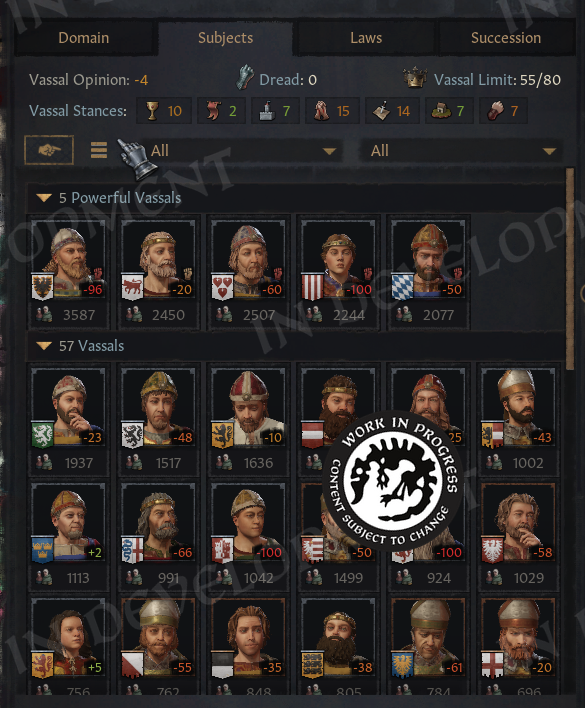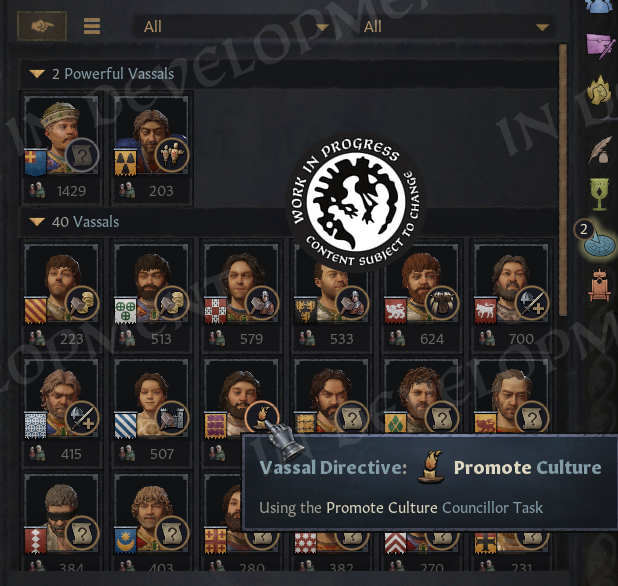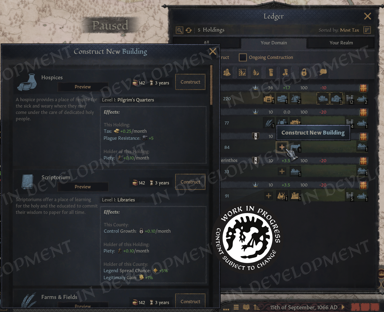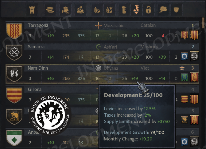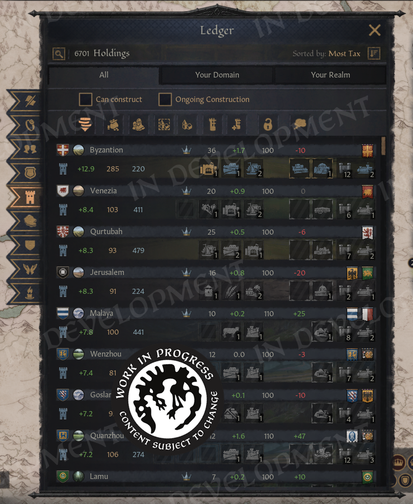 I was over the moon when they got this working! In a mod, it was only possible to show static icons, but now everything is fully interactable. If we want to build in our vassals’ holdings, we can switch to our realm, sort by tax or empty slots, and start clicking.
