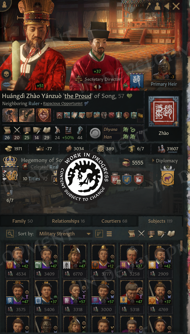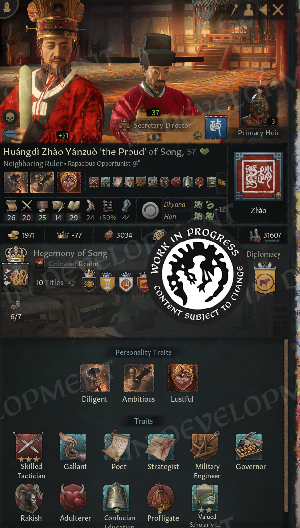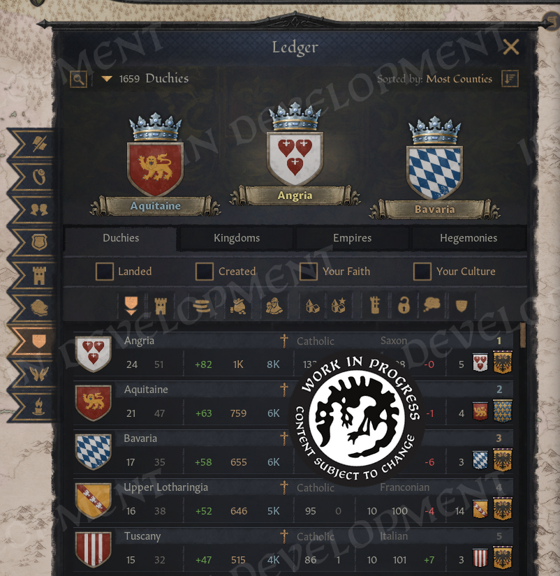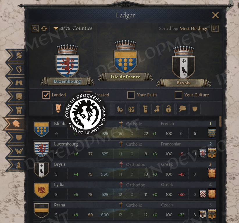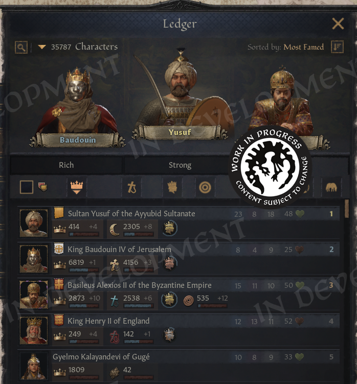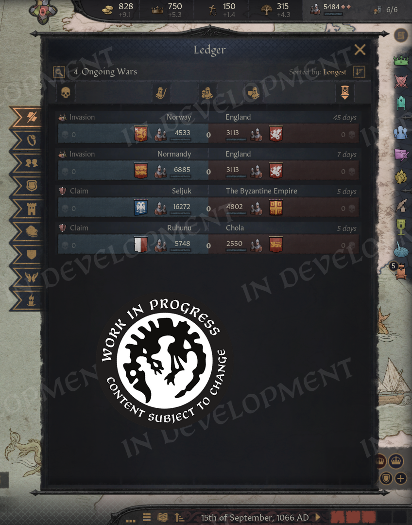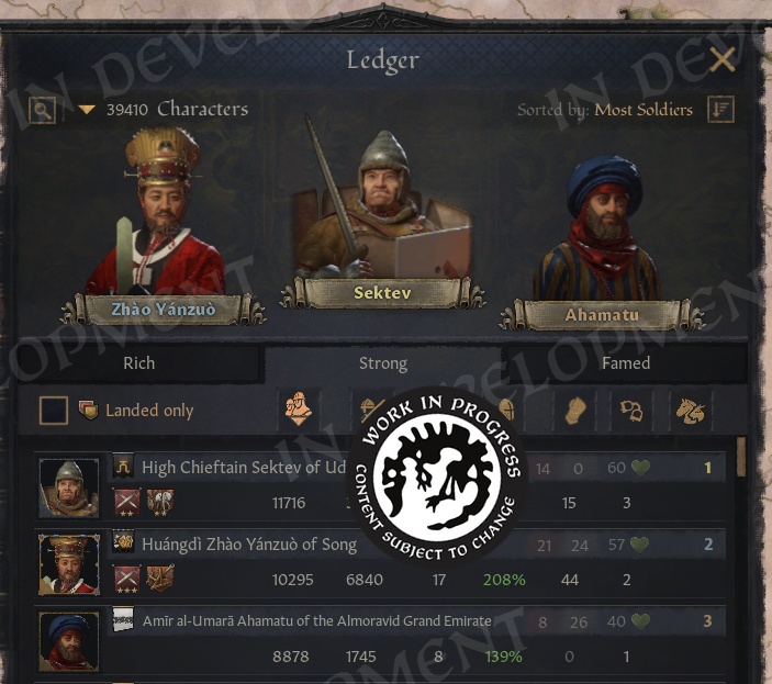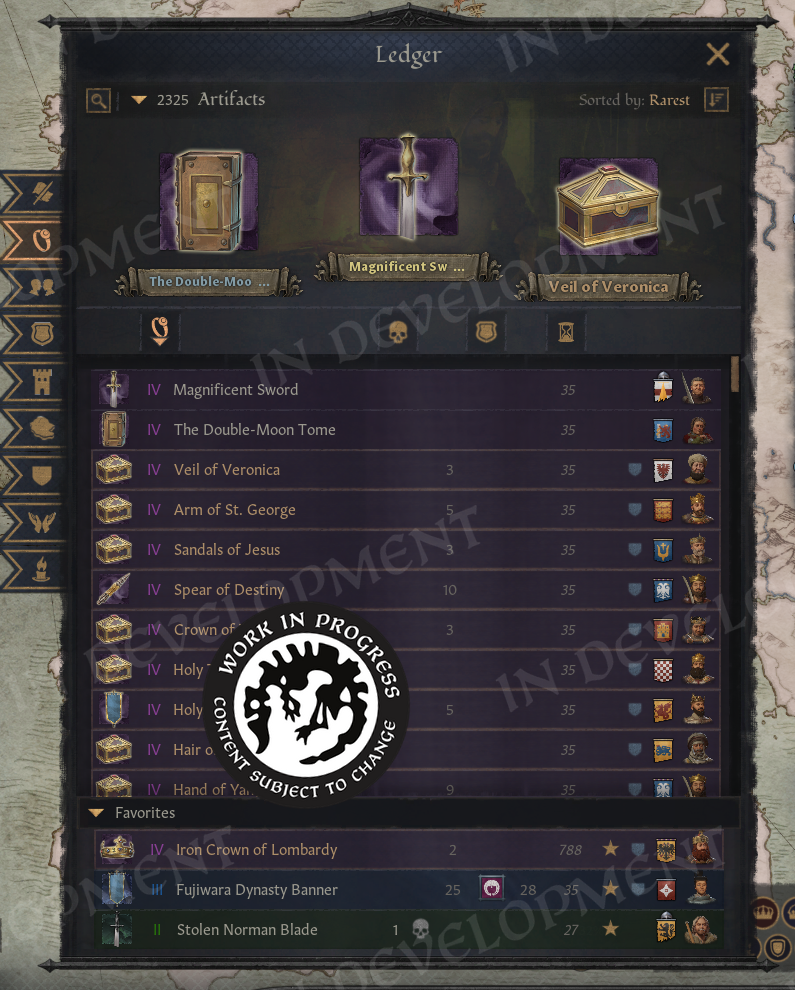Hi everyone!Back in February, we gave you a sneak peek at what we have in store for our major update. We saw how eager many of you were to learn more, so we wanted to take the time to expand on the update and show off more of the changes coming soon.For this diary, we are joined by a special guest, who will introduce themselves next.A Familiar FaceHello everyone, I'm Agami or @Agamidae here. The mystery modder behind part of this update.I'm a UX designer, I've spent 2000 hours modding CK3, and you already know my work. I made the Fullscreen Barbershop, back when it wasn't fullscreen, and I made that Big Battle View you see in Koifish's videos.Years ago I had a dream. I wanted to finally put an actual functional ledger into the game.One weekend later, I had it :) \[/p]Imperator was the game that hooked me on Paradox modding and UX design. I wouldn't be here without it. So, a couple years later I started on the CK3 ledger:\[I'd actually forgotten what started it. Turns out, it was greed.]Then I got sidetracked a little for a… few years. Spent them making a mod for blind people, so they can play CK3 now, gathered more ideas for the ledger. I Learned a lot in the process.Then, last summer I got a call from the Big Platypus. Alexander Oltner asked: what would you do if we hired you?I pulled up my ledger, which by then had lists of characters, artifacts, wars, provinces, houses… And got hired on the spot (Well, okay, I got hired 6 months later, because Swedish bureaucracy is no joke).They said, we'll give you a programmer, you'll have 2 months, do for us what took you 5 years… And anything else you can think of. The months flew by, and here we are! The ledger is only one part of the update, but it required mountains of code, so I need to shout out my partner in crime, Petter Hansson. The update wouldn't exist without his code, so please everyone, say thank you, Petter.Now, let us begin. With one man's tragedies and statistics.The LedgerYou open the ledger from the hud, next to the date.\[You can also access it through a shortcut!]And yes, you're going to see a lot more new shortcuts.The Ledger has 9 pages in total, you switch with bookmarks on the side, and the first page is all “Ongoing Wars”.\[This list will populate fast.]Wait a few years and you'll see a hundred wars.\[You can even sort them by length or by total soldiers.]Or we can sort them by losses. Yes, we are tracking losses now! That's what the skulls are. You can open any war from the ledger, of course. You can open any of its items, in fact.So, let's take a closer look at wars and return to Ledger in a second.War LossesThe War View now shows how many Soldiers or Characters (!) were lost by each side in the war.\[No more guessing how badly your enemies, or you, are doing.]Going more in depth, the War View now shows battle losses first, including which side suffered the most. The Battle Score tooltip also lists how many soldiers fought and died in each battle, which makes it especially satisfying to spot stackwipes.Next, we show attrition losses. These are approximate, since things can become complicated when multiple wars overlap. And, of course, in a game about characters, we also count any characters lost during the war.The game will try to save any notable characters who died in the conflict, such as rulers and their close family members, and display them in this tooltip. We also make sure to show these losses in the War Results screen, so you will not miss them.\[Now the humiliation feels even more real]I cannot tell you how much I wanted this feature. Petter made my dreams come true with this one. With it, we can better feel the impact of wars, and for us it has simply been fun to see just how many things are happening across the world. We look forward to seeing your highest tallies.We have also added a button to the Ledger that allows you to favorite wars, so you can keep track of any conflicts you find particularly interesting.\[10 years and 27 thousand fallen, for a single duchy]And that’s not just limited to wars, as you can favorite all of the items in the ledger, on every page! So, if you find something valuable, like for example…ArtifactsYou'll be surprised how many of them there are, even without the Royal Court DLC, you'll have hundreds of available artifacts, and with it enabled, thousands!\[Can’t wait for people to report multiple Excaliburs as a bug again]We can sort artifacts by rarity and filter them by type, so if you only want to see crowns, for example, that is easy to do. You can also view the artifacts that exist within your realm. Almost all pages now include filters, which can be opened by clicking the magnifying glass. The top three items in each sorting order are displayed in the podium area at the top of the page. This section can be collapsed by clicking to the right of the filters, giving you more space to scroll through the lists.We can also sort artifacts by the number of kills they have, although those tend to be ve