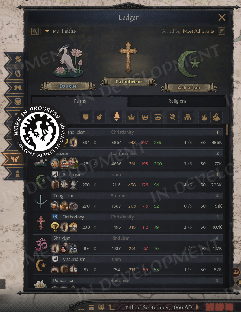 The page also shows whether a faith is currently involved in any holy wars and how many of its own holy sites it controls. In addition, we display its fervor and the total number of soldiers belonging to all rulers who follow that faith.