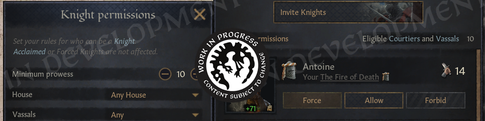 However, your permissions will be ignored by knights you have forced to serve, or by your Acclaimed Knights. If you choose to ignore this window entirely, it will not affect your game in any way. Everything will continue to work exactly as before.
