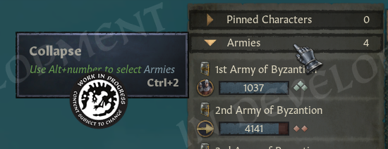 Each army now has a button that lets us cycle through them with N. Our holdings have one as well.