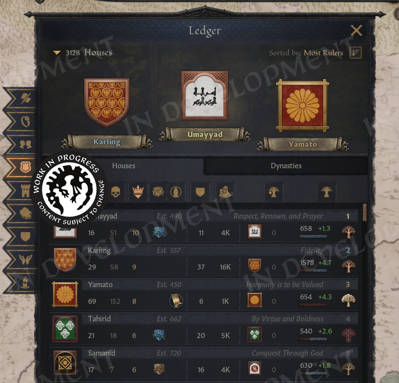 We will return to hotkeys again in a moment, but for now let us move on to the next Ledger page: Houses and Dynasties, which is on Ctrl+4, by the way.