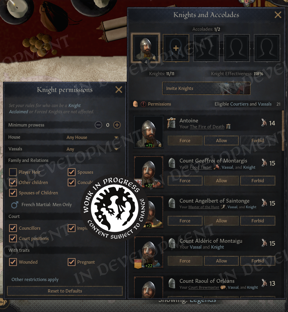 Have you ever lost your heir in a random battle because you forgot they were serving as a knight? Now we can prevent that. Simply uncheck a setting in Permissions, and your heir will never serve as a knight again.