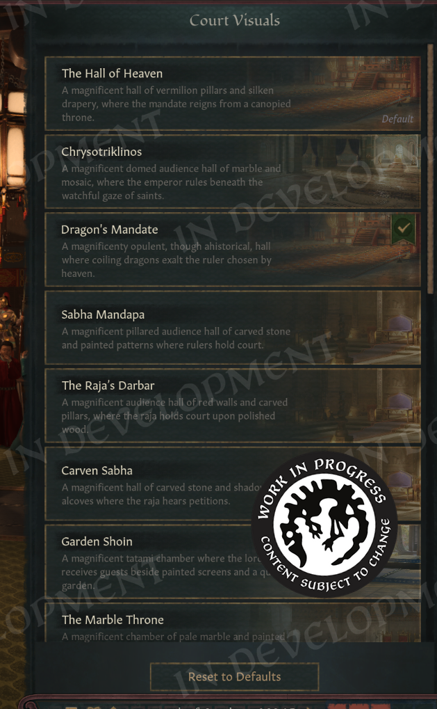 For those of you who read the All Under Heaven Dev Diaries, you might have noticed we showed off an earlier version of the Chinese Royal Court that we ended up scrapping. Well, I am happy to announce that the work of our talented 3D artists will not go to waste as you will be able to pick this as your court if you so wish.